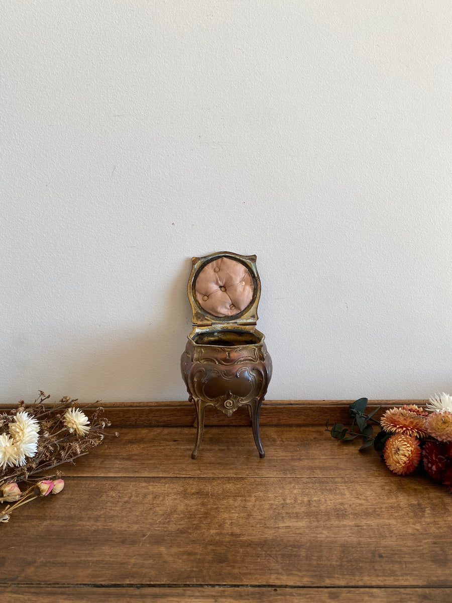 Élégant petit coffret en régule datant de la fin du XIXème. Capitonné rose bonbon. On adore ses jolis reflets mordorés.