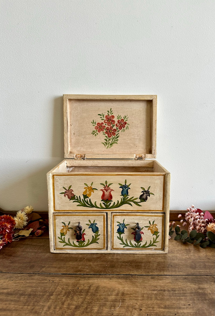 Adorable boîte artisanale en bois peinte à la main. Idéale pour y ranger vos bijoux et accessoires. Dotée de deux tiroirs et d'un compartiment de rangement sous le couvercle. Estimation années 80.