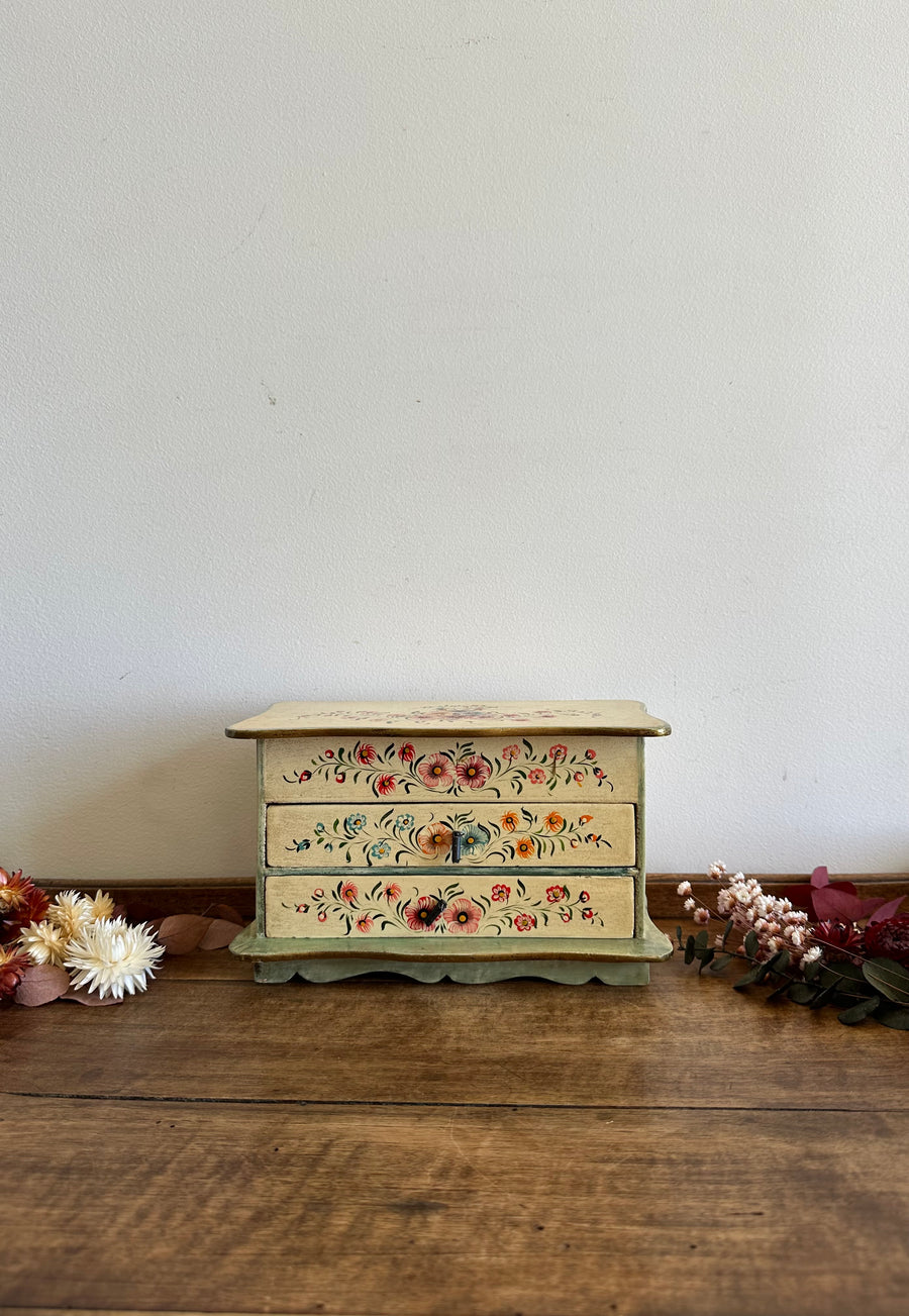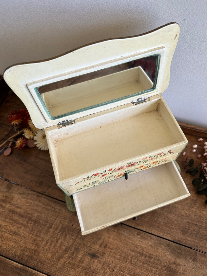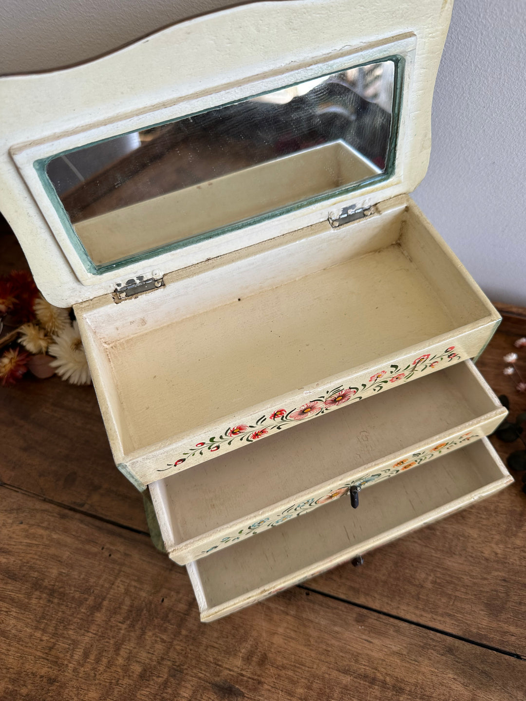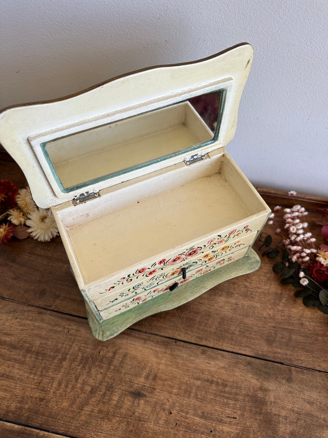 Joli coffret à bijoux doté d'un compartiment supérieur à miroir et de deux petits tiroirs de rangement. Estimation années 80. Décoration florale peinte à la main. Coffret en bois.