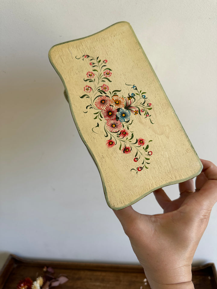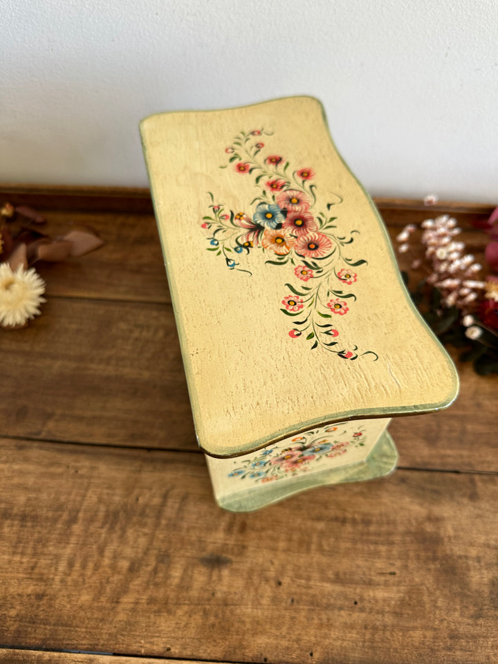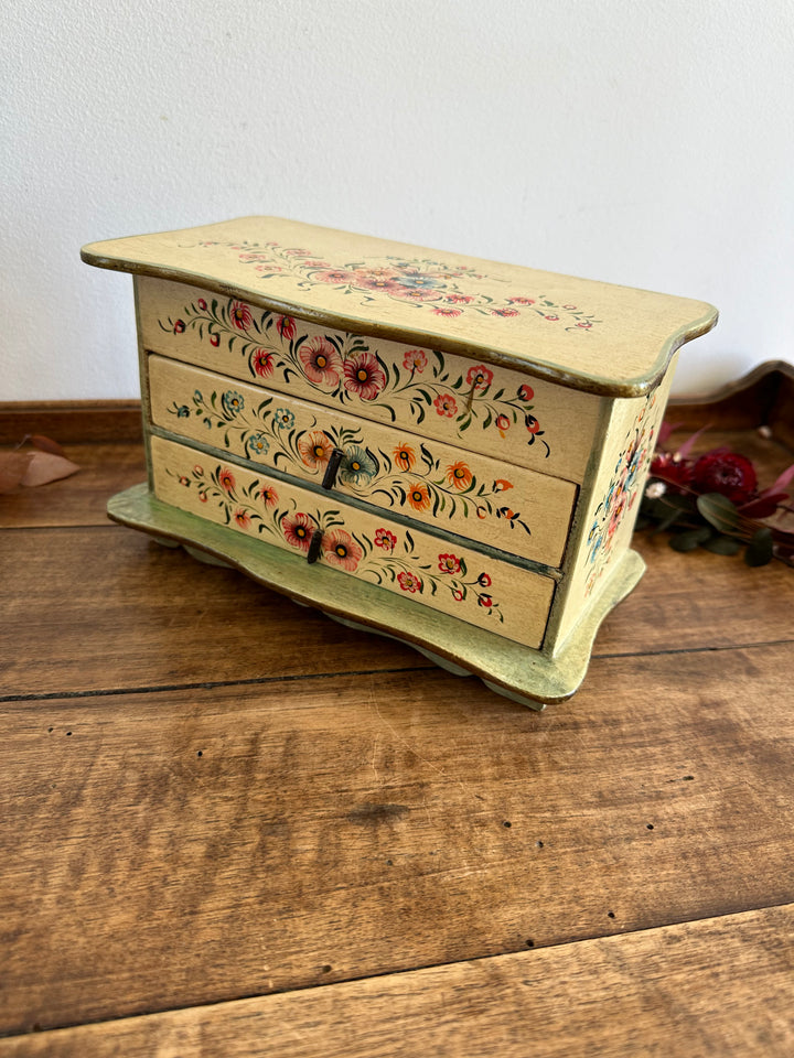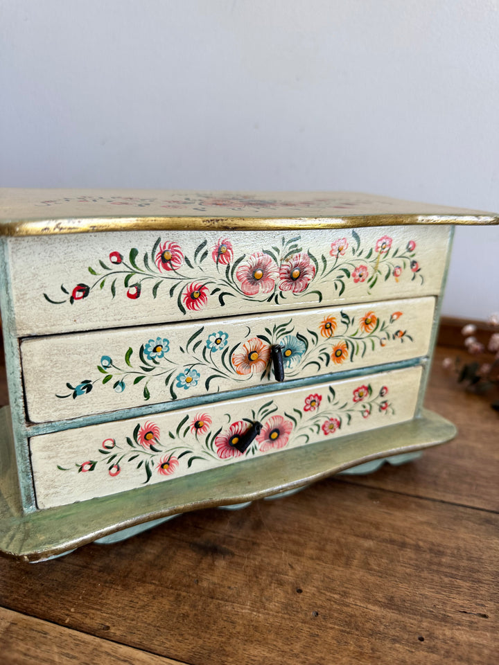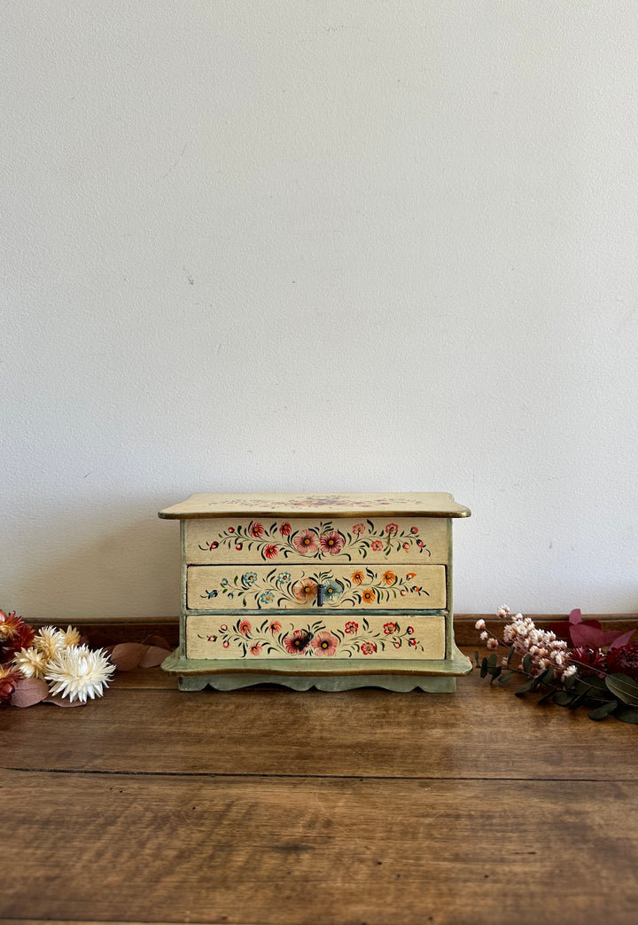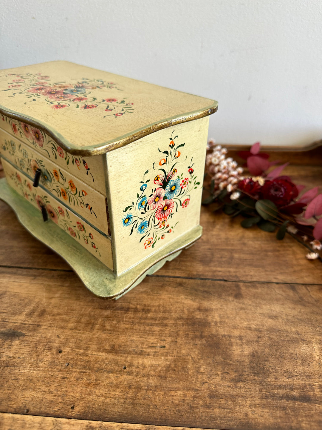 Joli coffret à bijoux doté d'un compartiment supérieur à miroir et de deux petits tiroirs de rangement. Estimation années 80. Décoration florale peinte à la main. Coffret en bois.