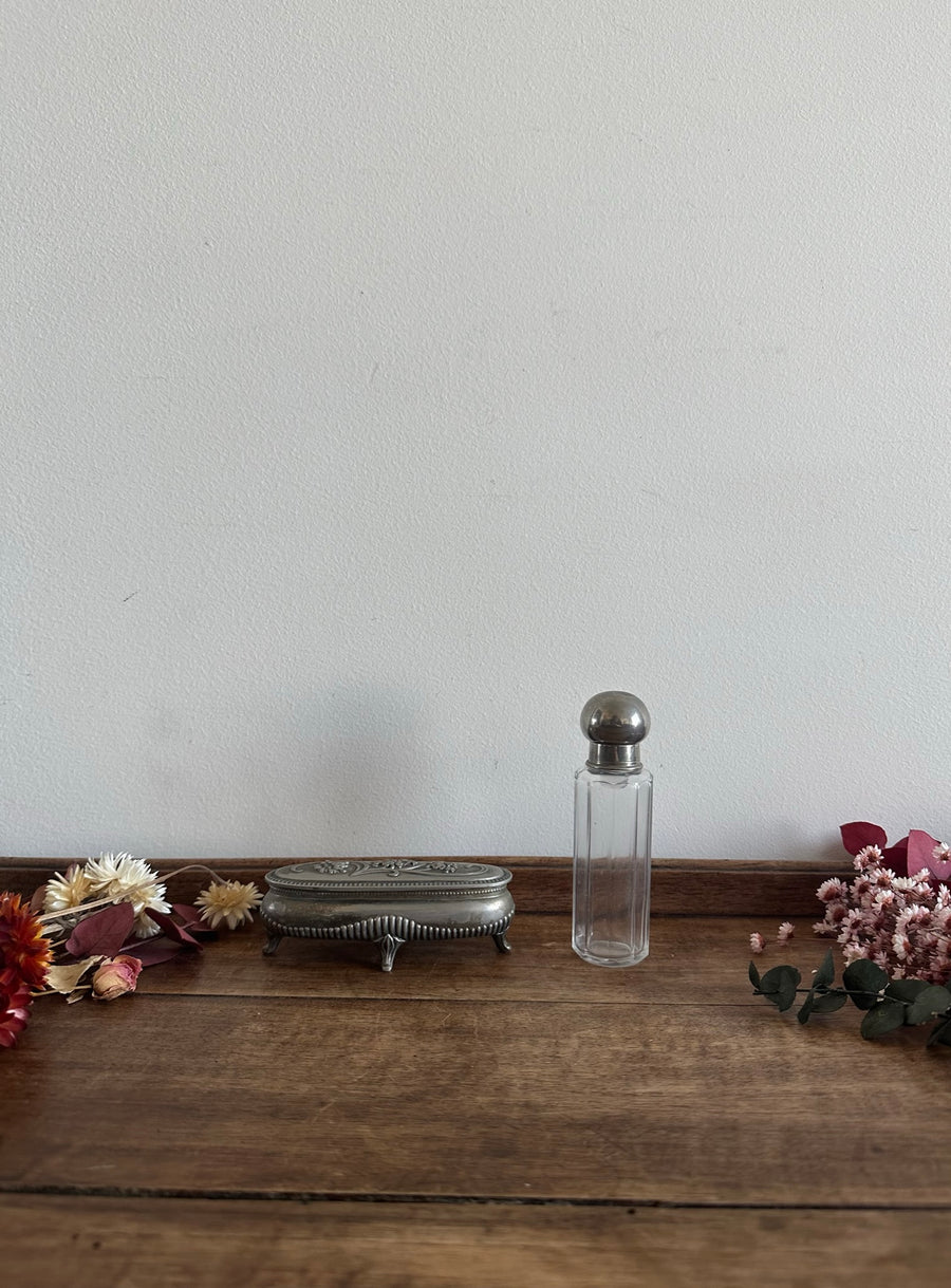 Joli pilulier en métal argenté doté de roses sculptées et d'un écrin de velours rouge, assorti d'un petit flacon à parfum datant des années 20. Muni de son bouchon intérieur et d'un capuchon rond en métal argenté que se visse. A noter, un petit manque au niveau de la fermeture du flacon, qui n'empêche en rien de visser le bouchon.