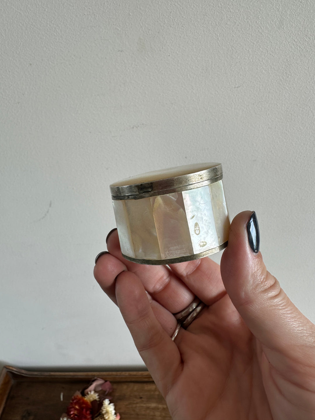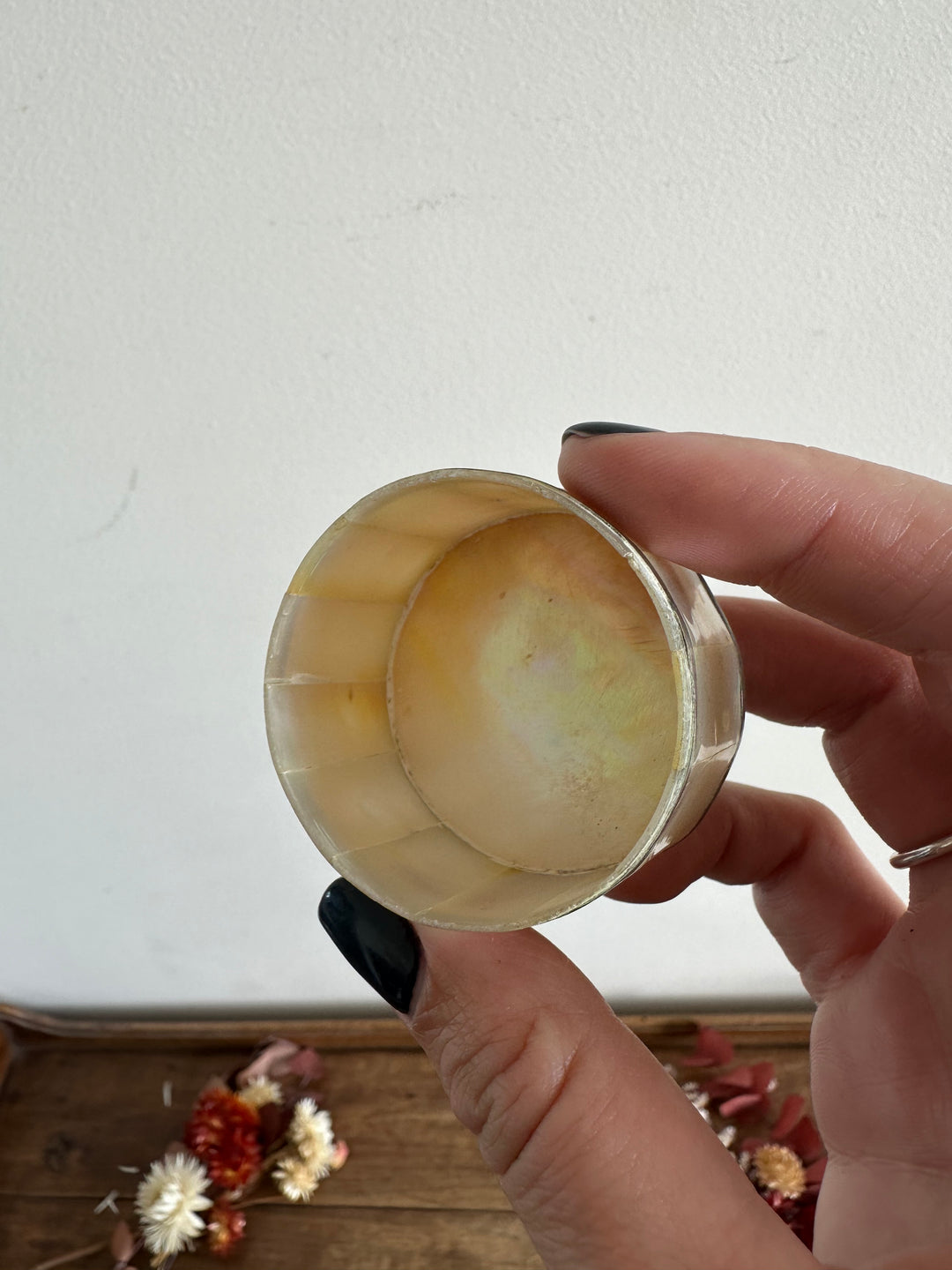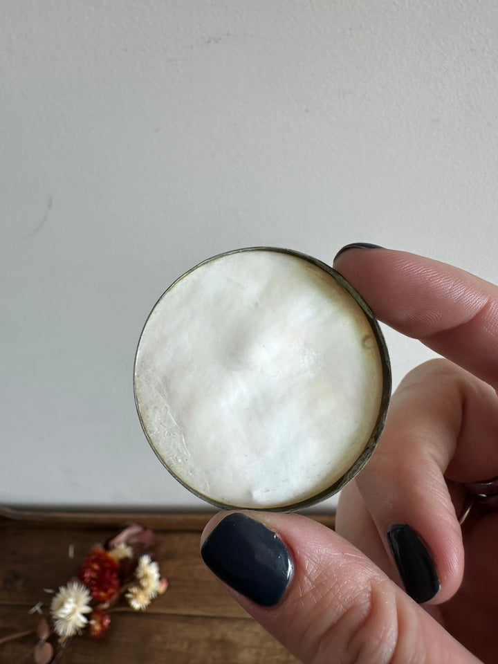 Joli petit pilulier rond en nacre cerclé de métal argenté.