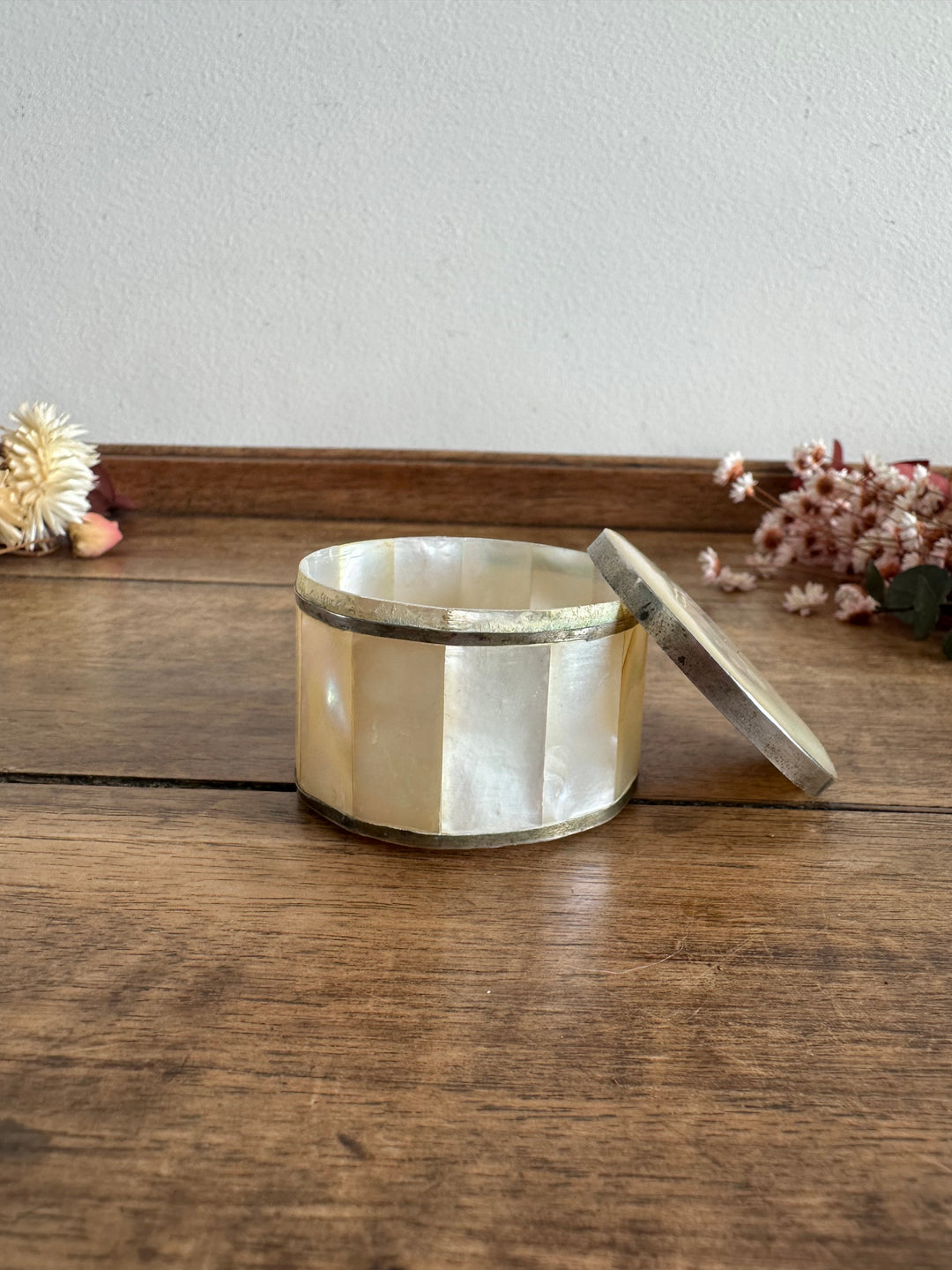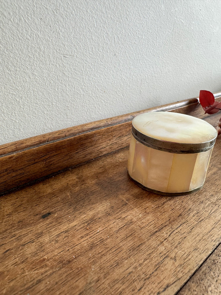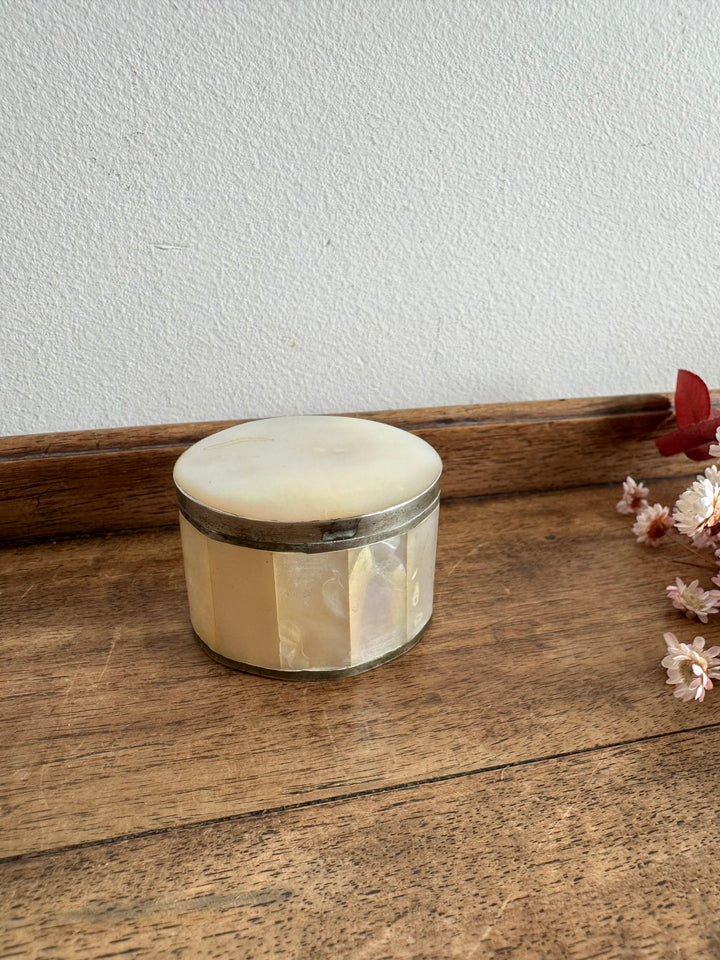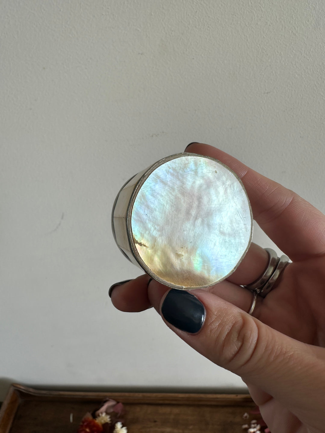 Joli petit pilulier rond en nacre cerclé de métal argenté.