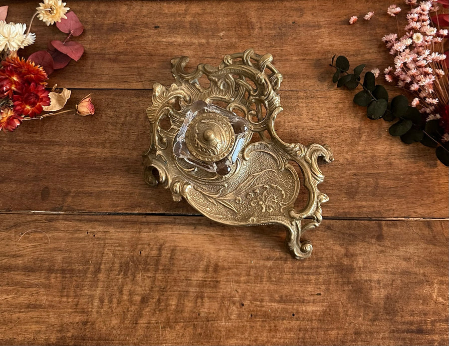 Bel encrier en laiton, doté d'un pot à encre en verre taillé et son couvercle en laiton travaillé. Jolie représentation de muguet, pieds défilants.