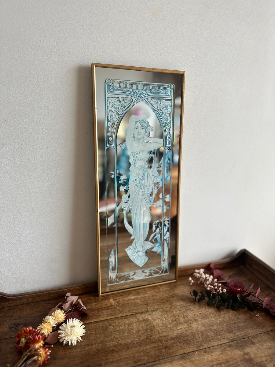 Ravissant miroir décoratif d'après Mucha. Bordure en laiton. A noter : Une petite imperfection sur l'un des côtés, visible sur les photos et reflété dans le prix du miroir.