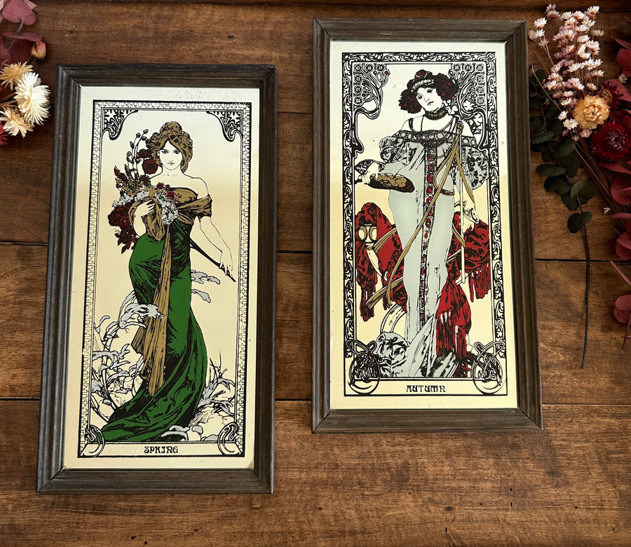 Charmant duo de miroirs rectangulaires décorées d'impressions d'après Mucha. Vendus séparément