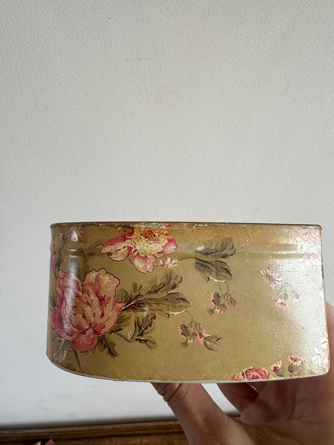 Charmante boîte en métal, décoration florale anglaise. Estimation année 80; Boîte en métal recouverte de papier floral