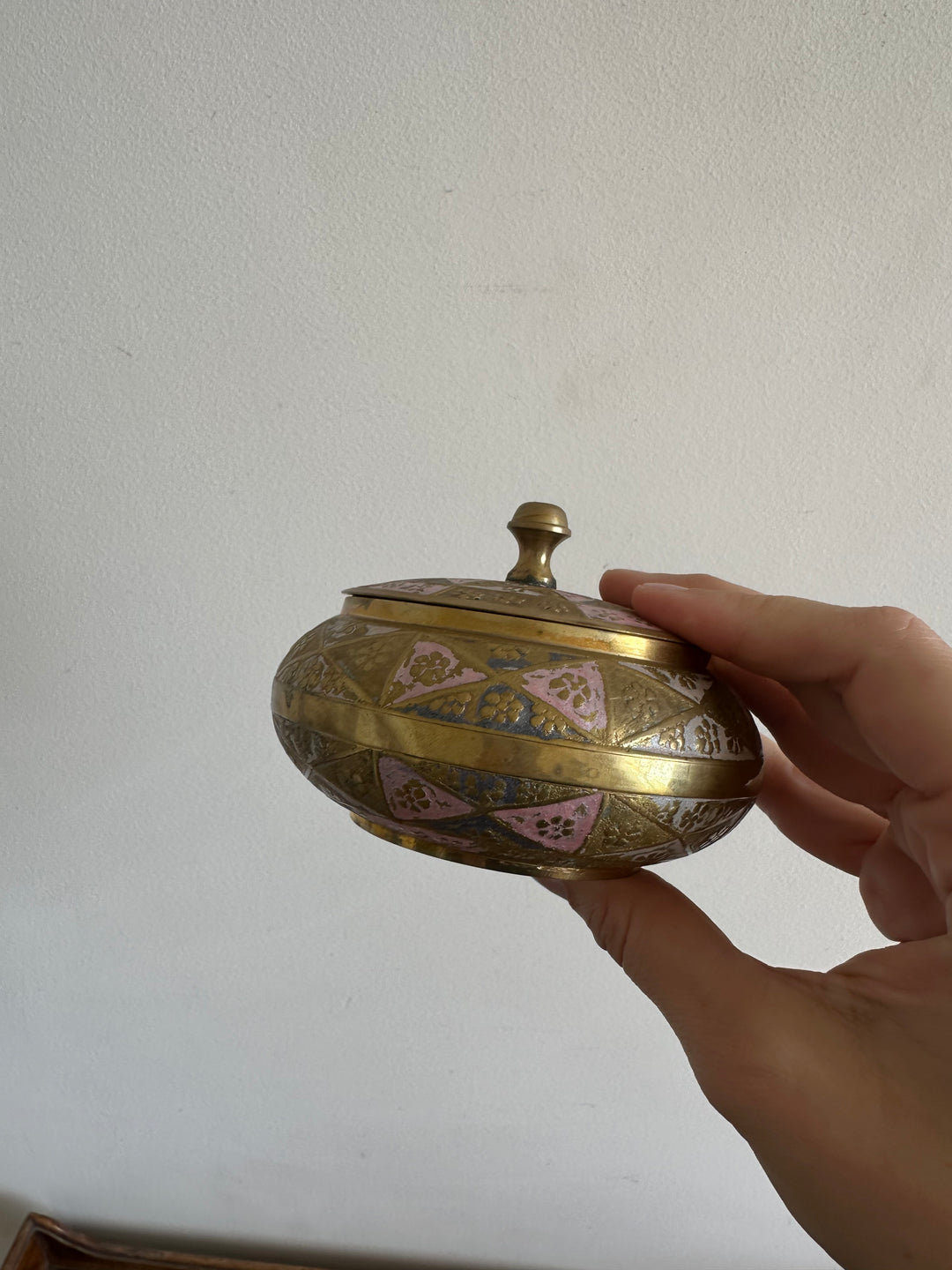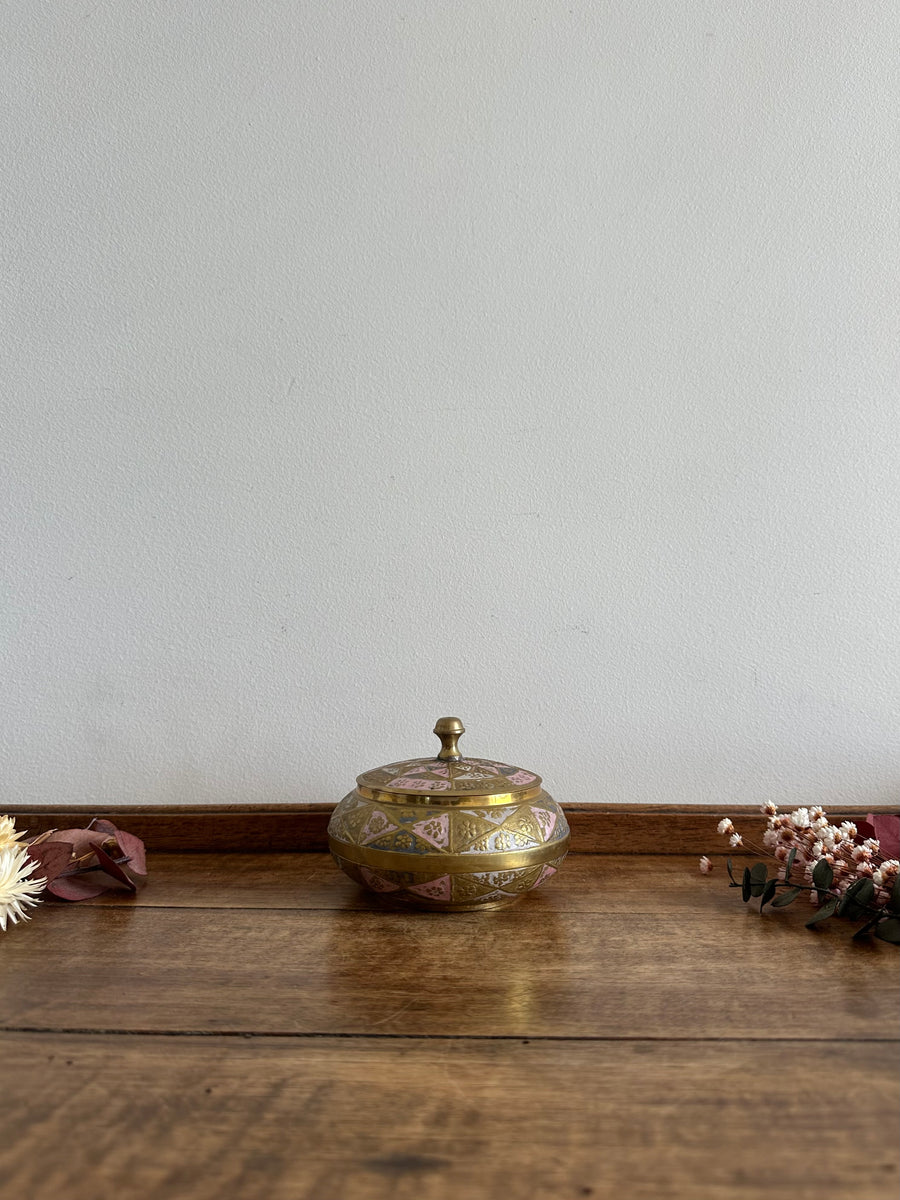 Bonbonnière en laiton émaillé or et rose