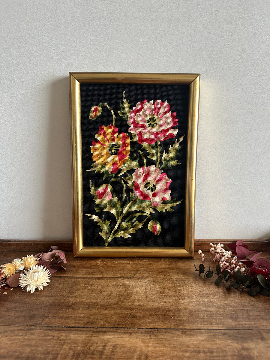 Jolie broderie au point de croix dans son cadre en bois doré. Motifs bouquet de fleurs roses et oranges sur fond noir. Estimation années 80