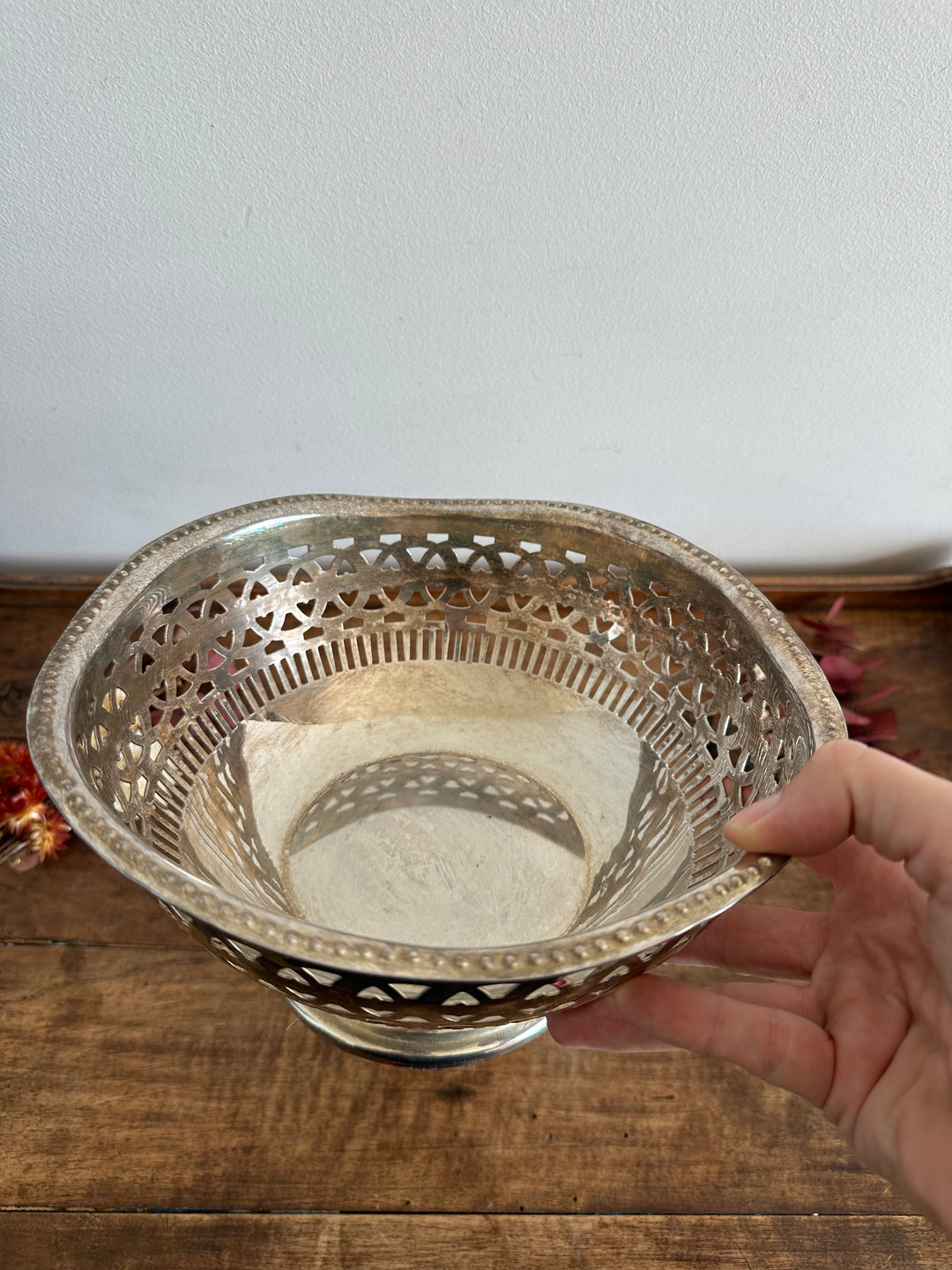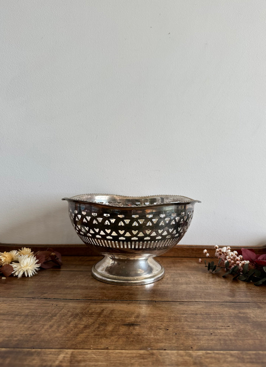Belle coupe à fruits en métal argenté ajourée. On aime sa forme et ses bords ondulés. Estimation années 70.