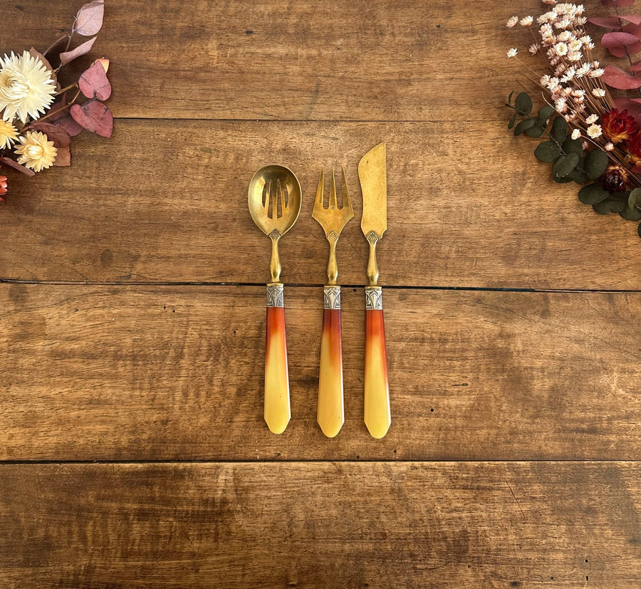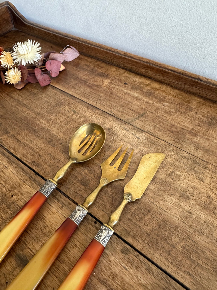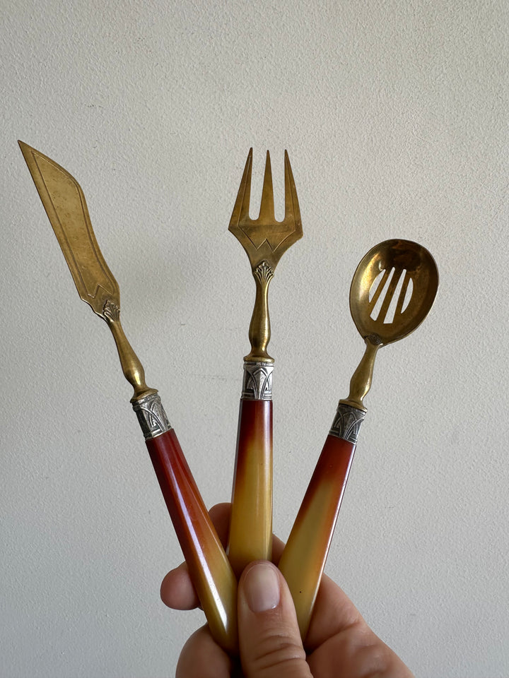 Joli ensemble de 3 couverts de service en vermeil et bakélite Art Déco. Vendus ensemble