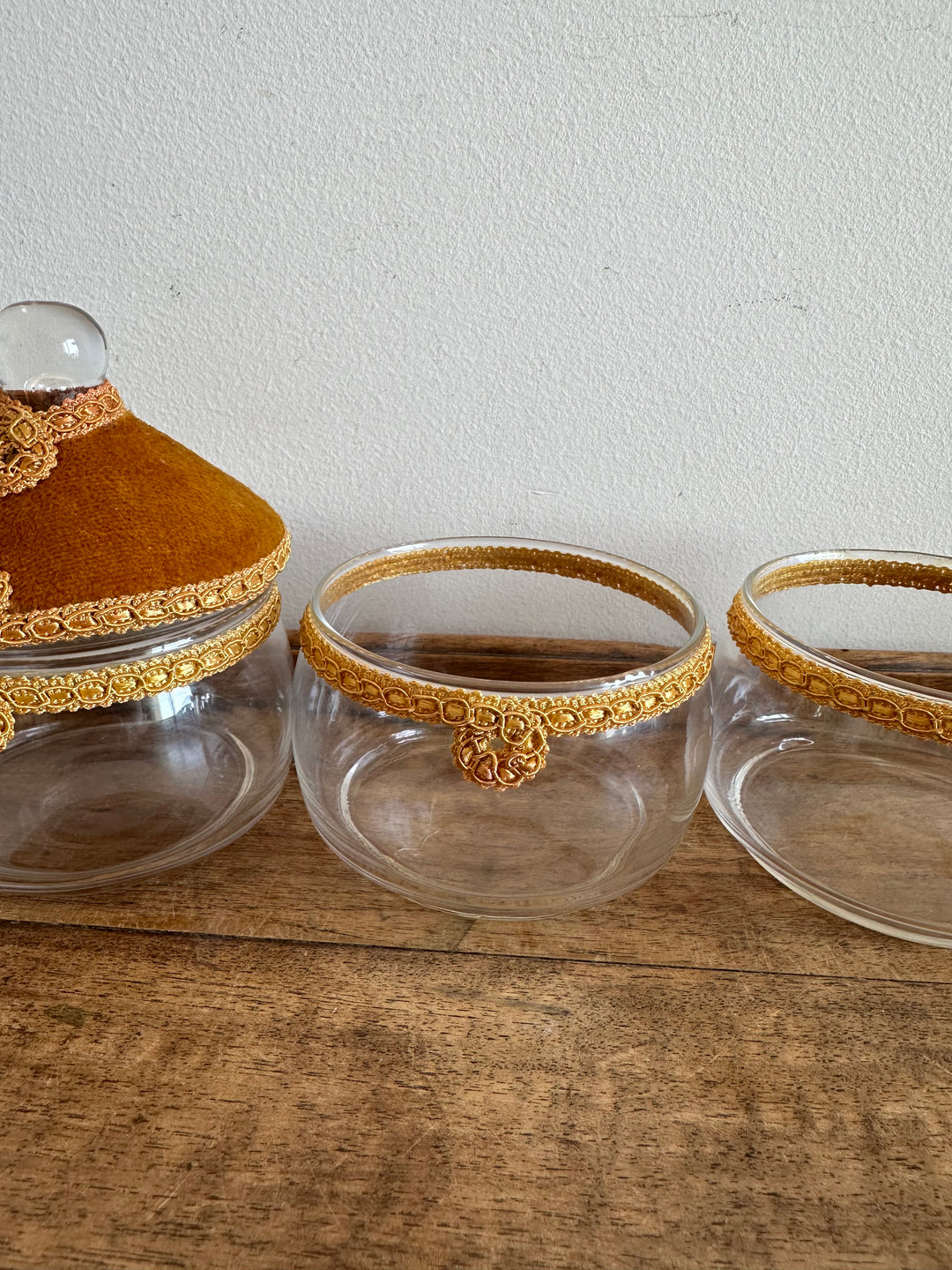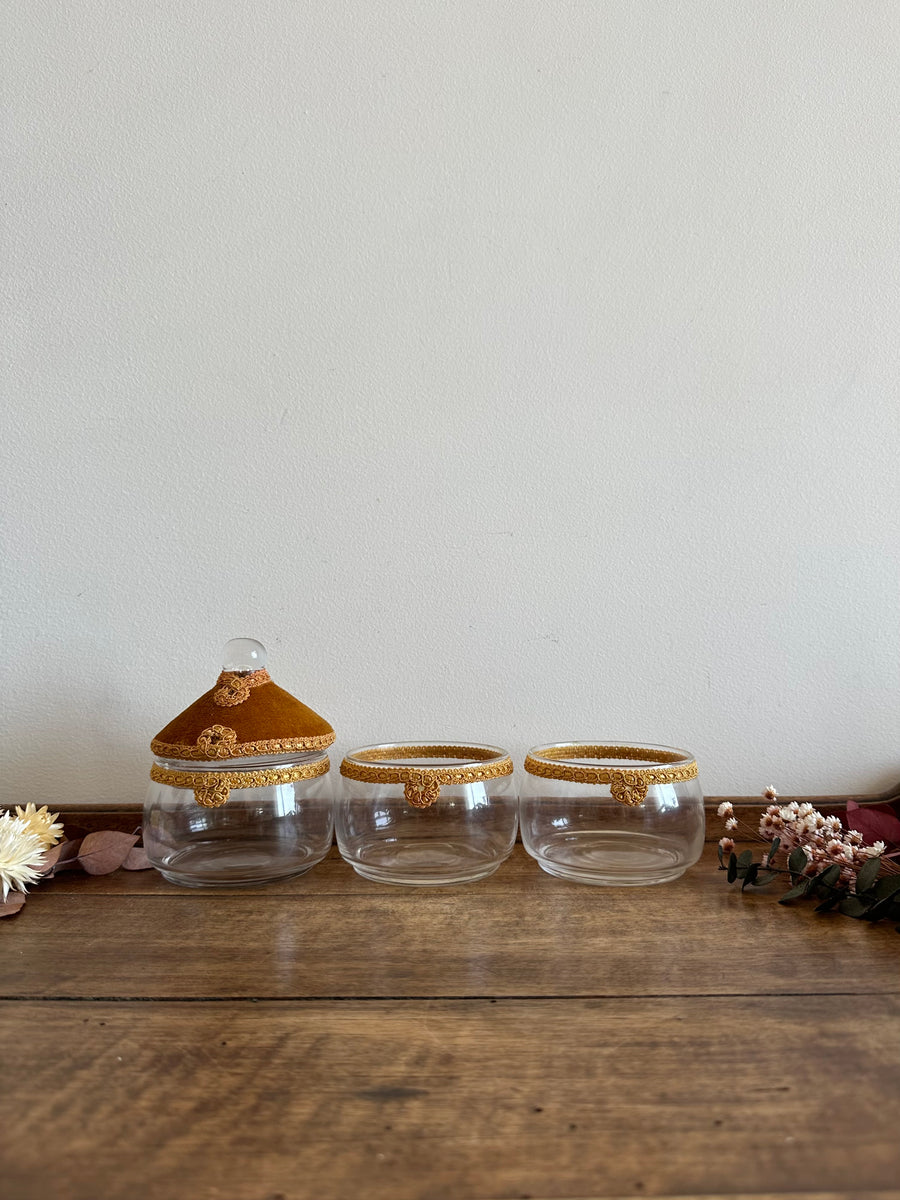 Adorable ensemble composé d'une bonbonnière à couvercle recouverte de velours moutarde et de deux pots assortis. Pourront être utilisés comme ensemble de salle de bain ou comme rangements décoratifs. Vendus ensemble. Estimation années 60.
