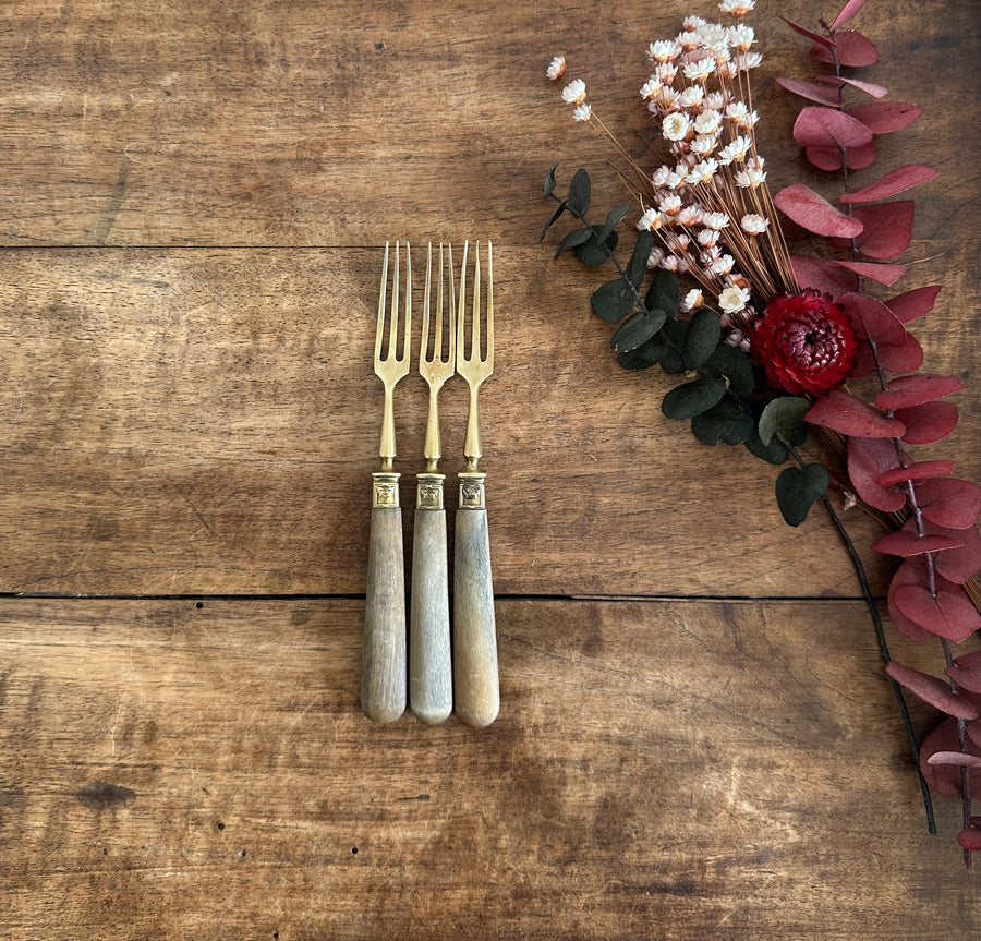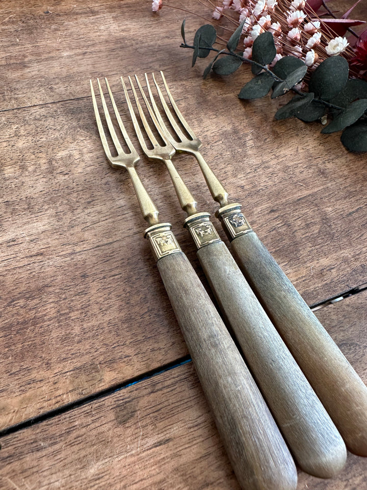 Joli petit lot de 3 fourchettes à dessert anciennes. En vermeille et corne. Idéal pour les collectionneurs ou amateurs de vaisselle dépareillée ! Estimation années 50-60