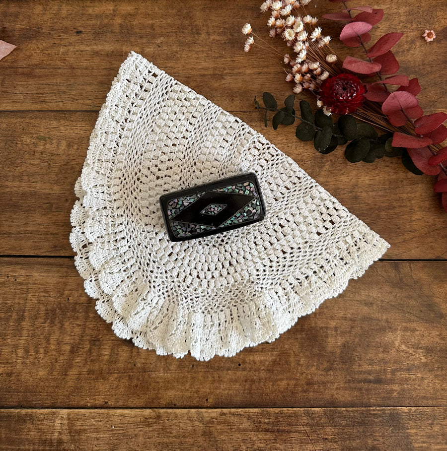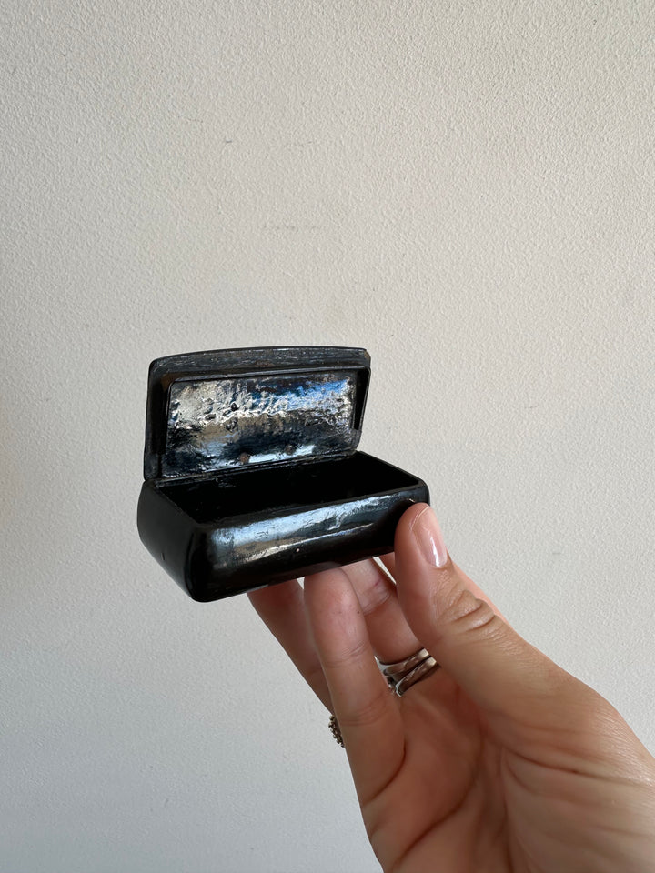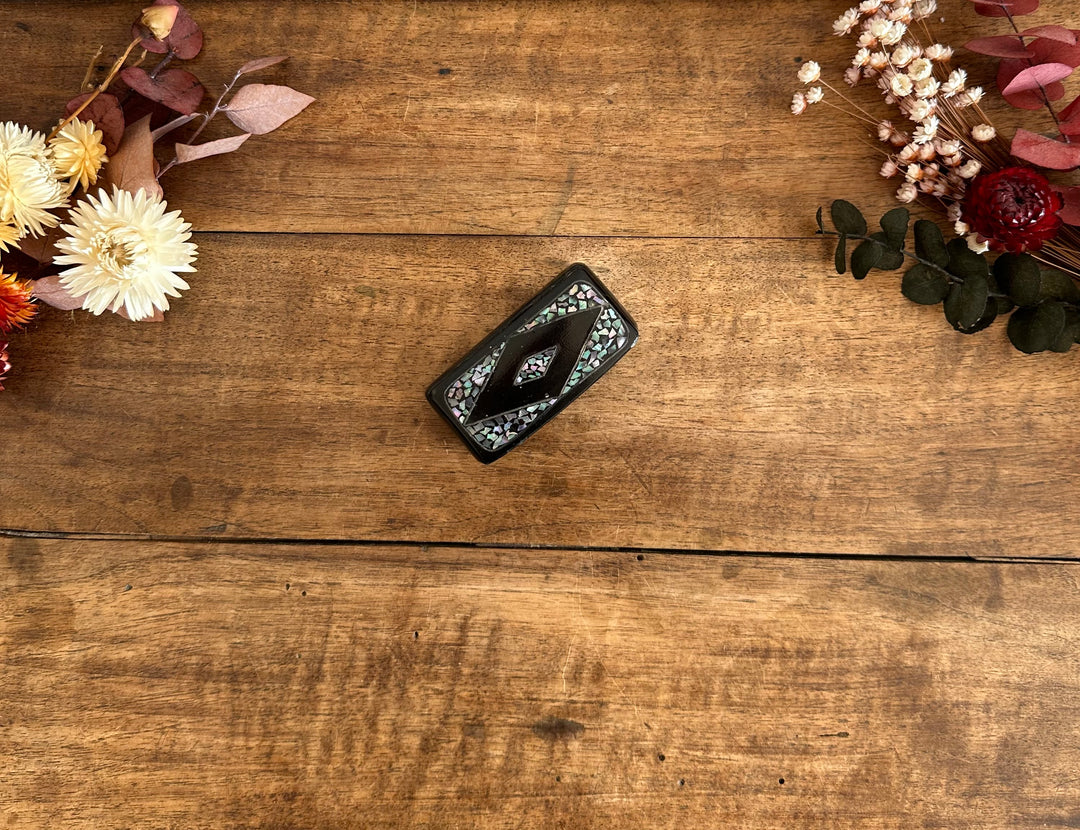 Adorable petit pilulier en bois laqué orné de facettes nacrées. Objet ancien et imparfait comme on les aime. Estimation années 1900