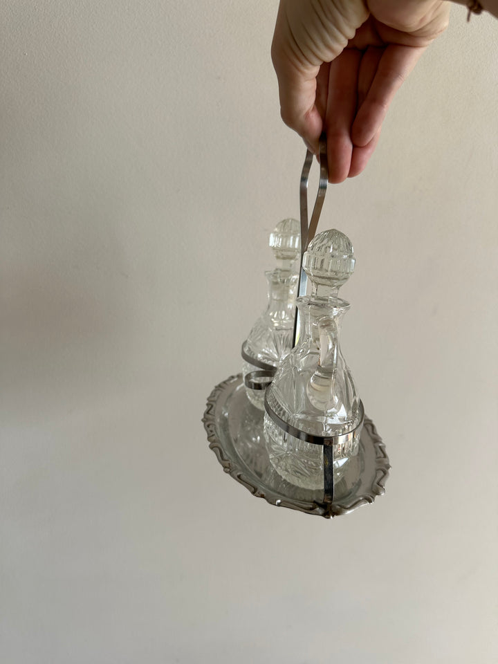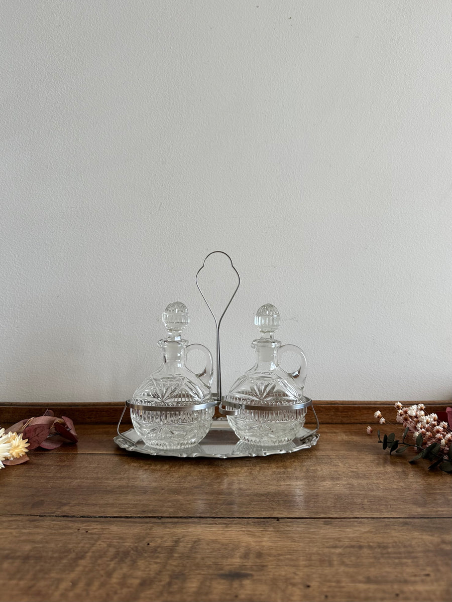 Beau serviteur de table en verre ciselé. Plateau en métal argenté. Estimation années 70.