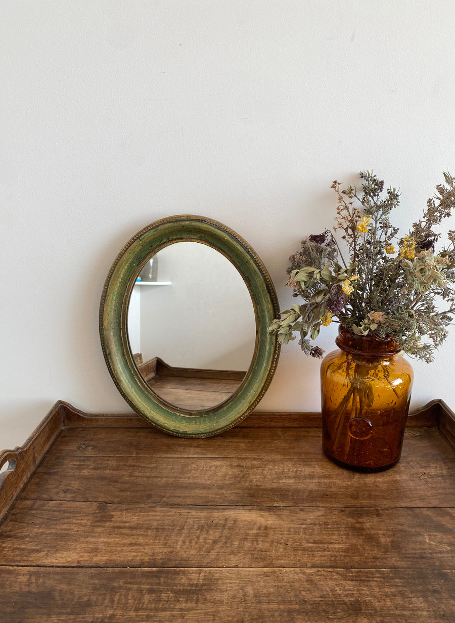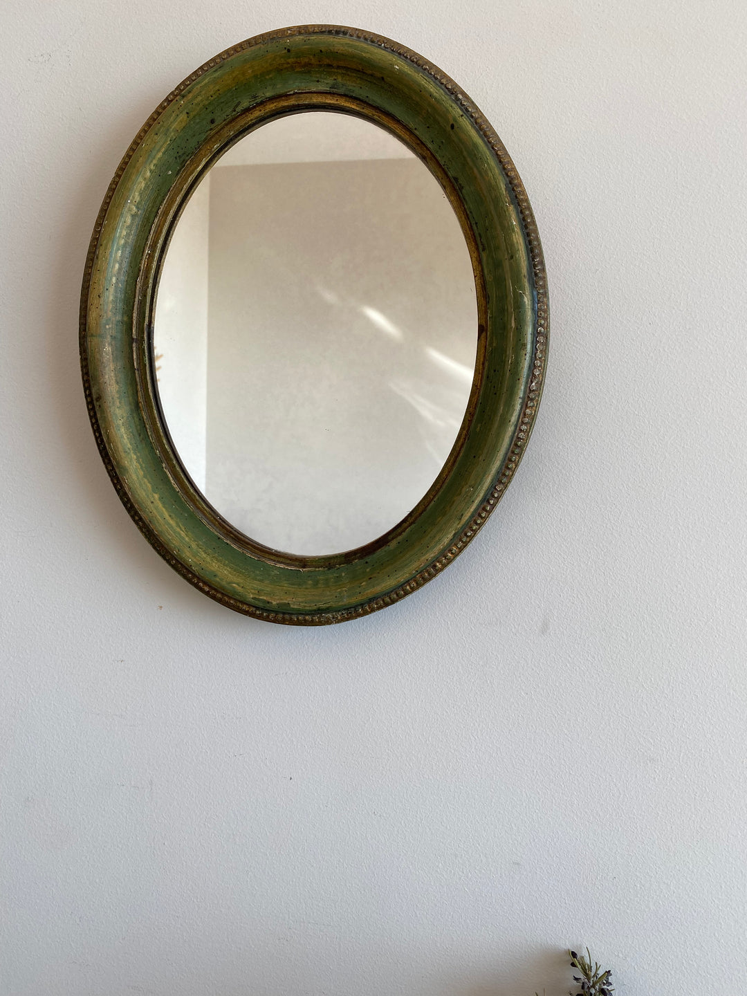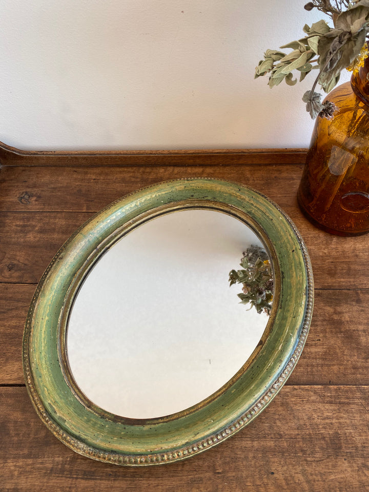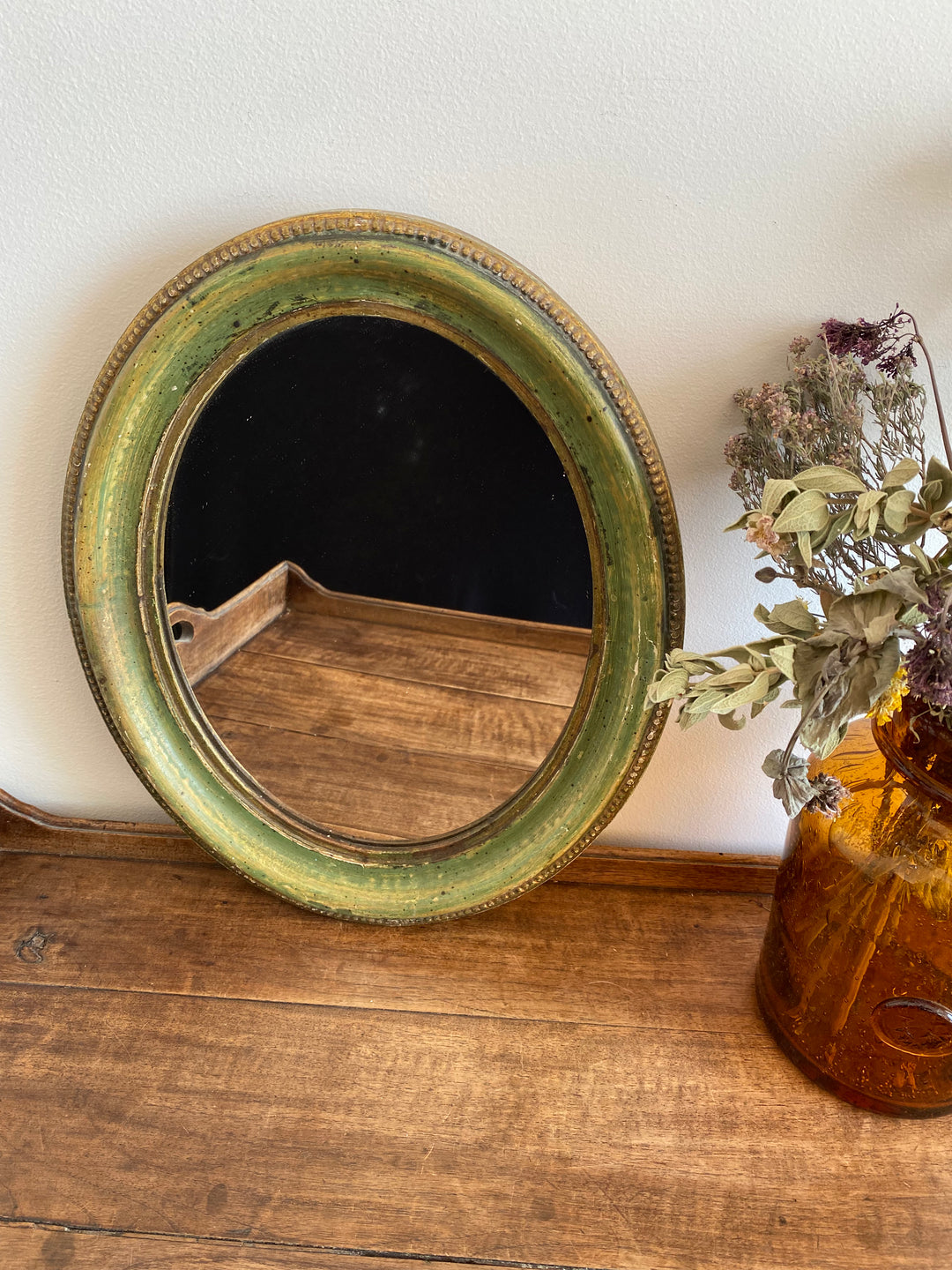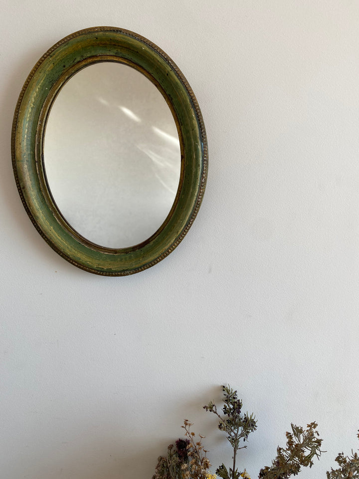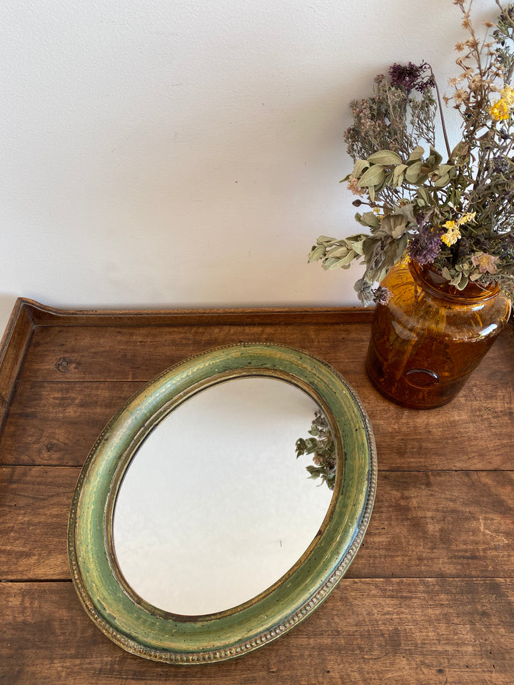 Élégant miroir au mercure, de forme ovale, en bois aux reflets vert mordorés.