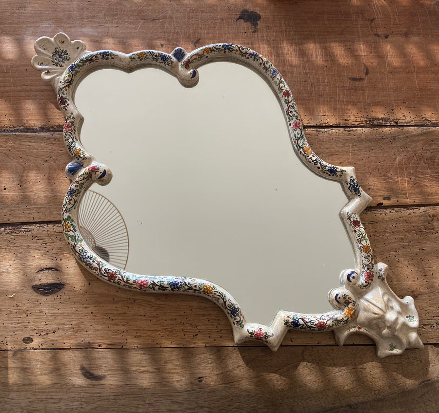 Ravissant miroir en céramique peinte, avec ses jolies touches de couleurs et fronton coquillage.