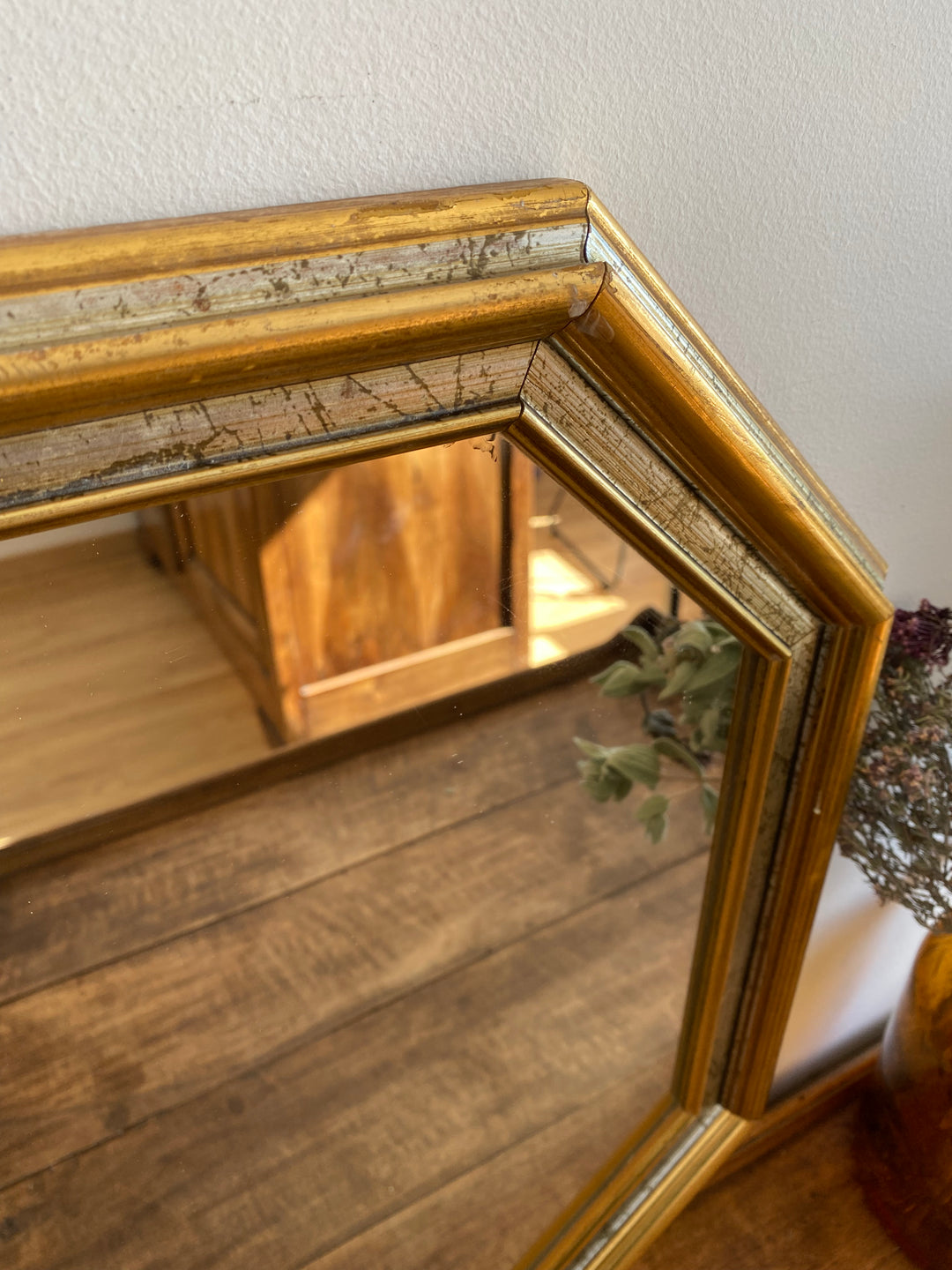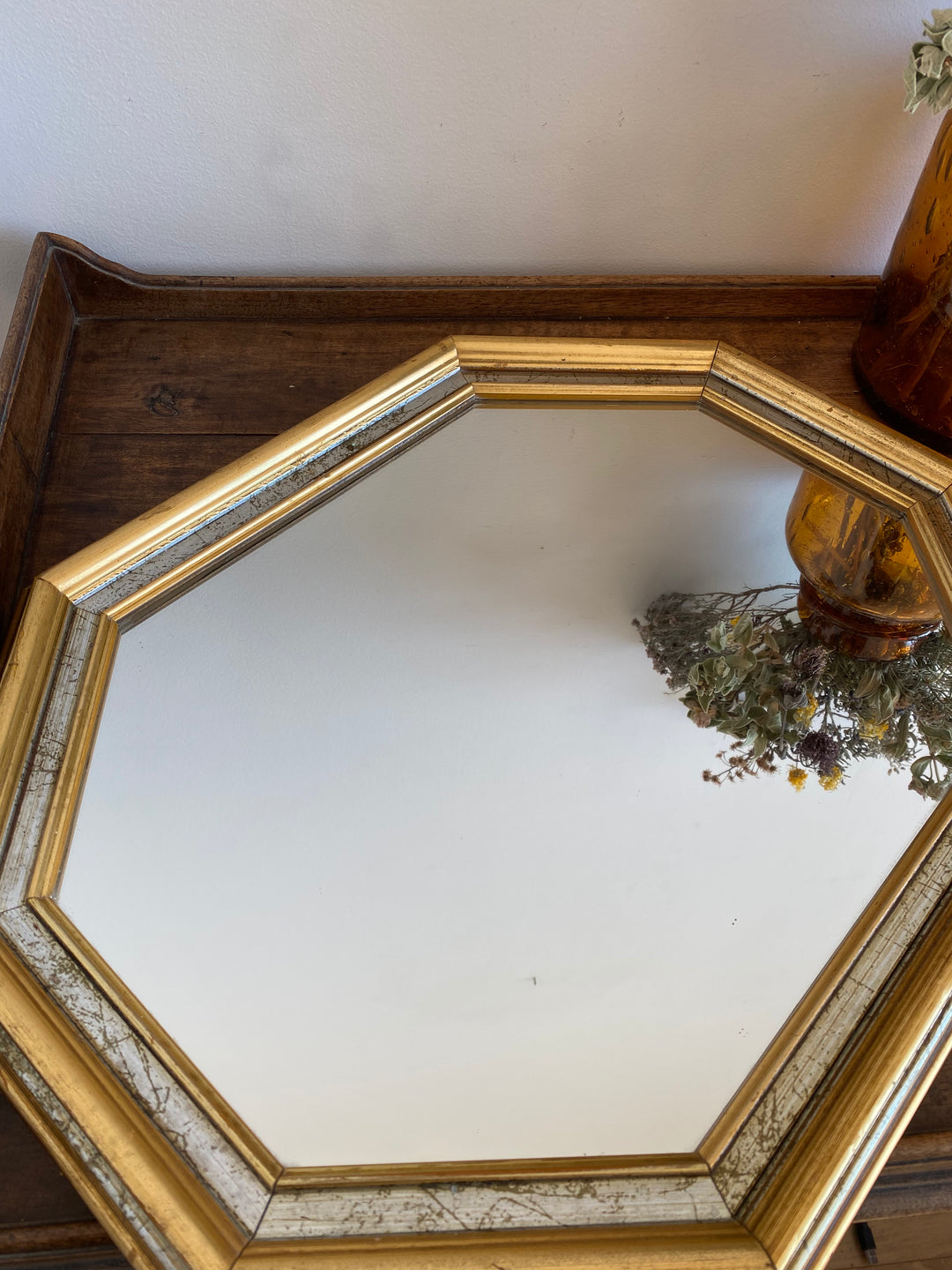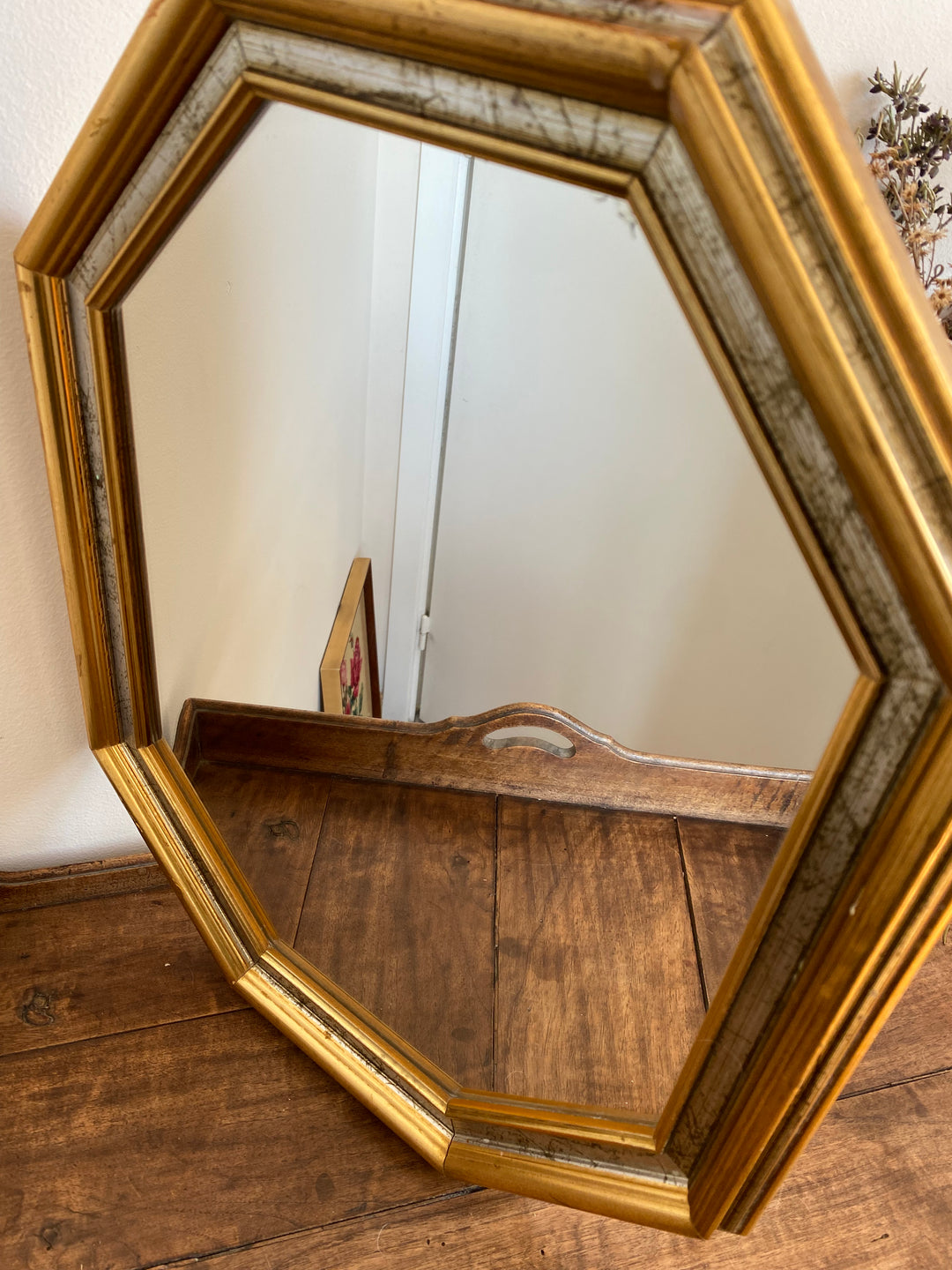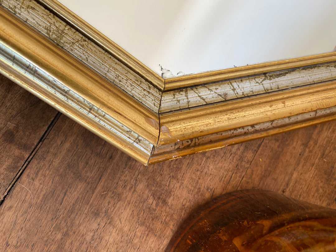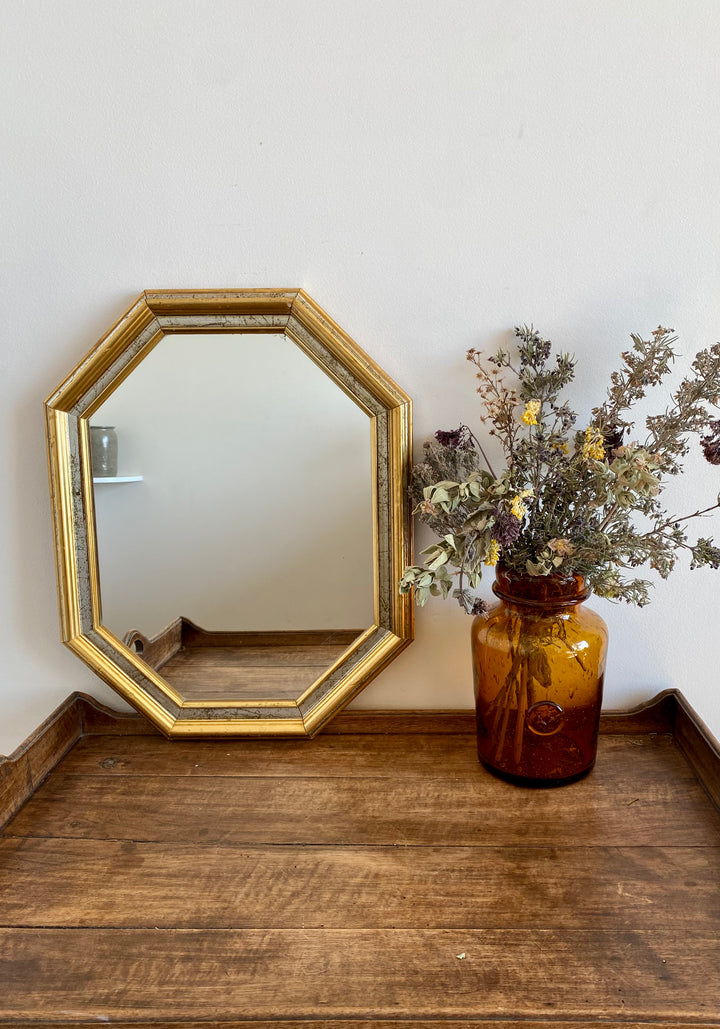 Ravissant miroir en bois doré et gallon argenté de forme octogonale