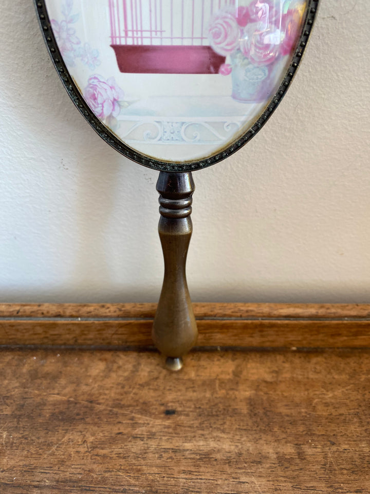 Ravissant petit miroir à main en métal doré. Doté d'une discrète bordure perlée et d'une jolie représentation de cage à oiseaux dans un esprit romantique.