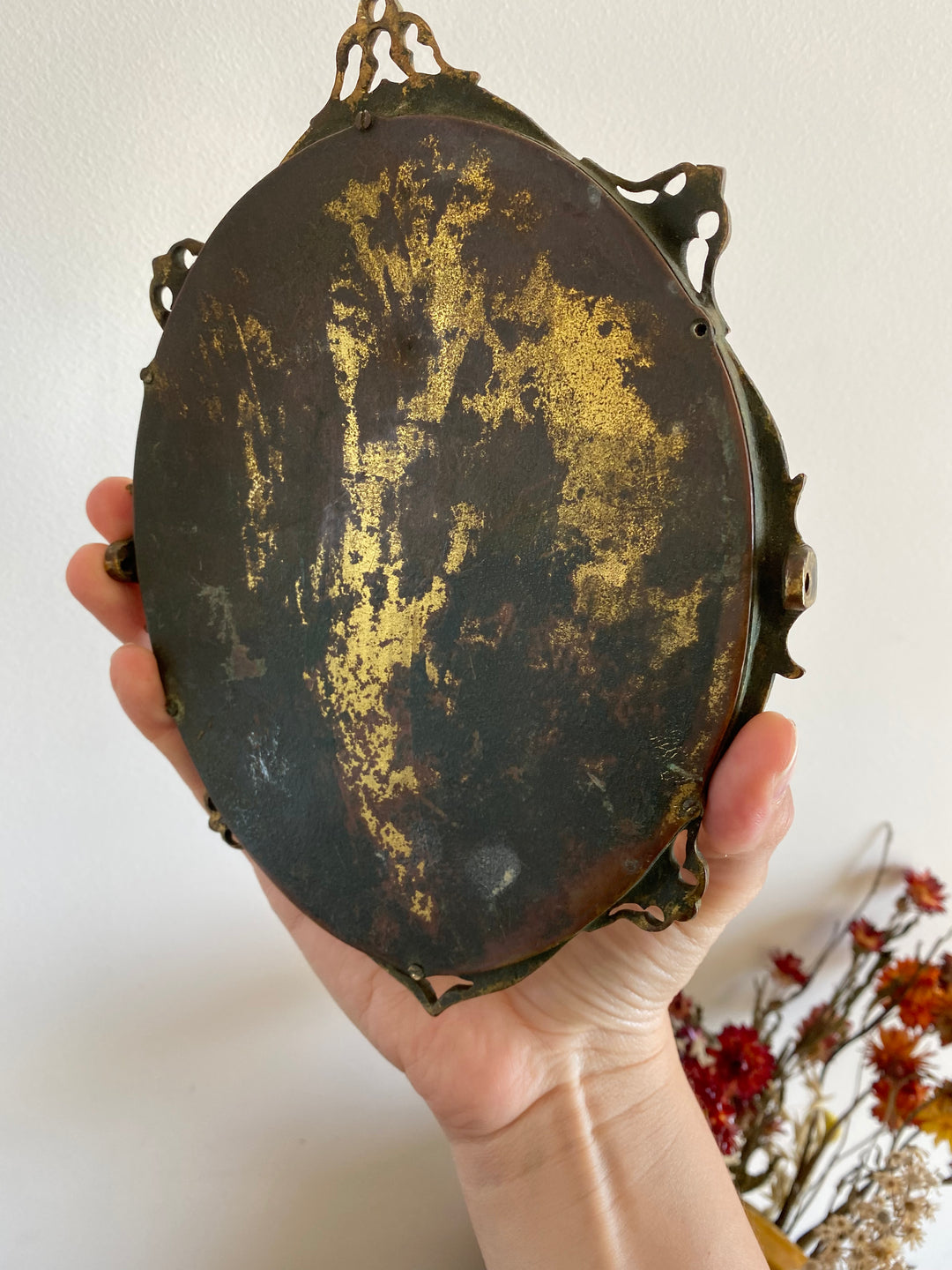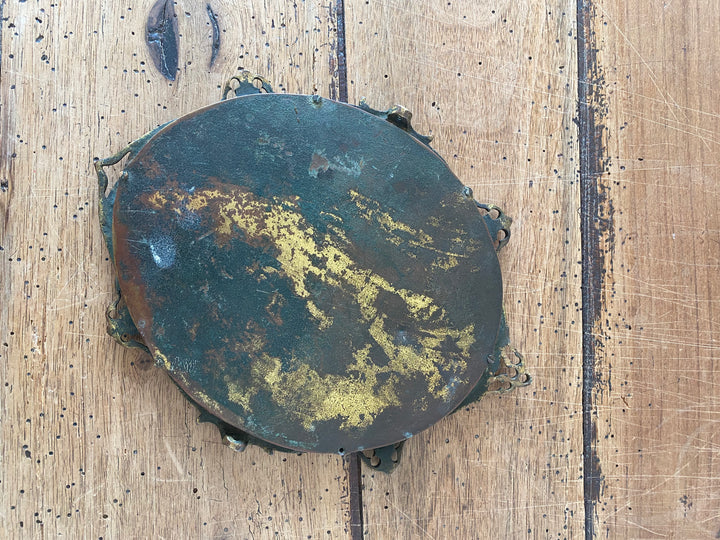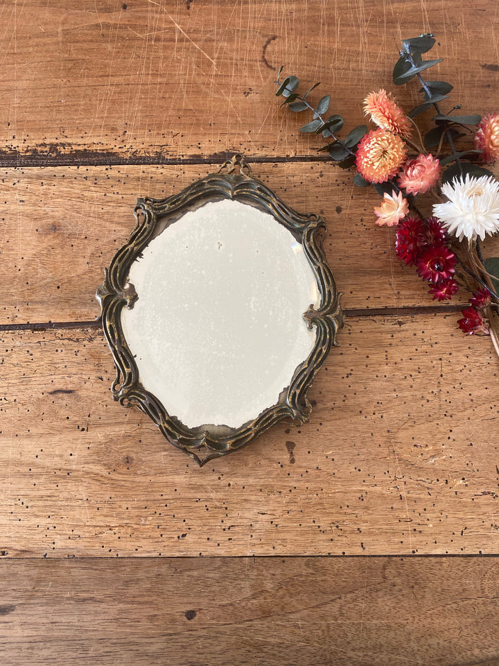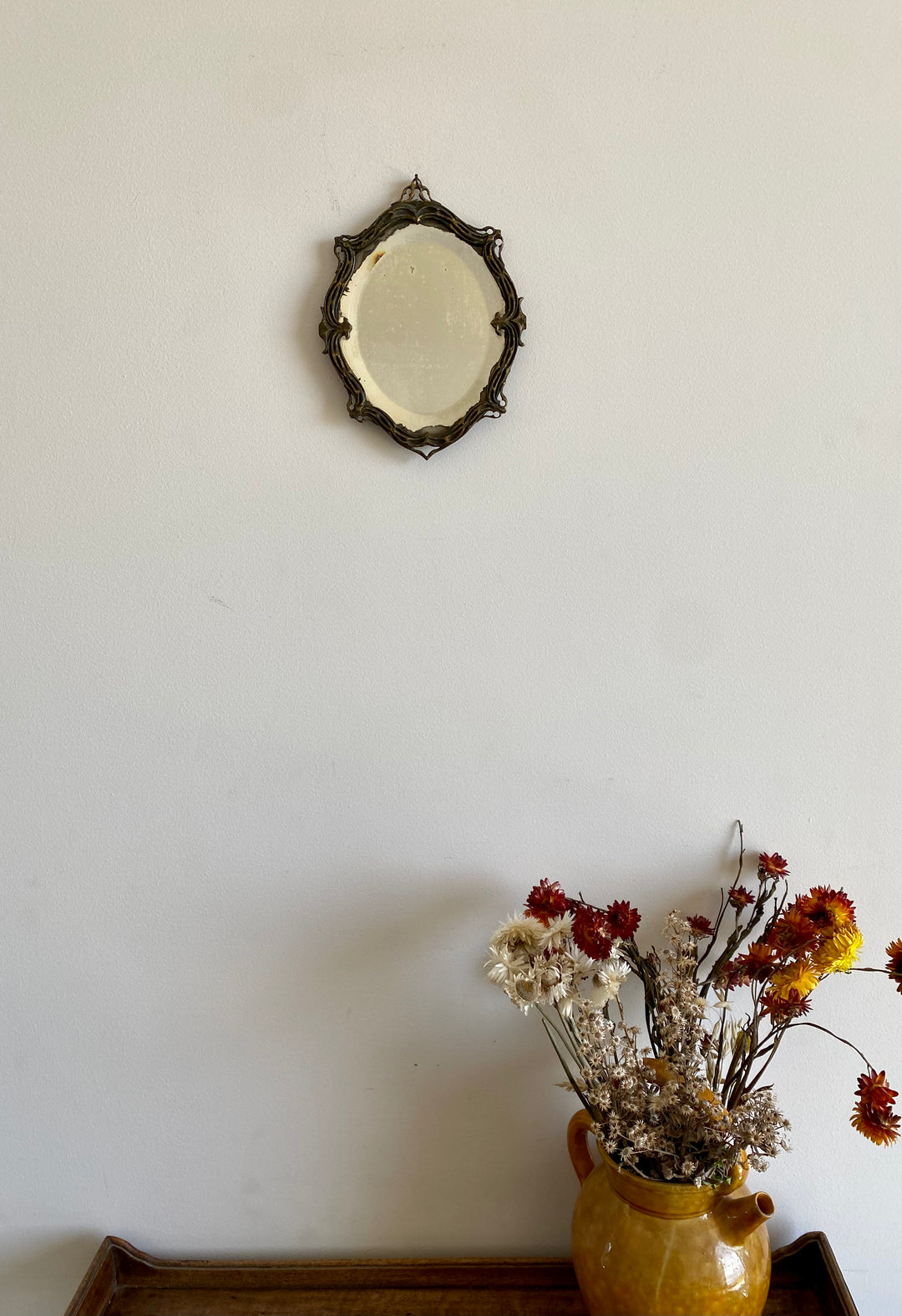 Petit miroir très ancien en bronze avec son verre biseauté et ses belles imperfections. Le modèle parfait à ajouter à un pêle-mêle mural.