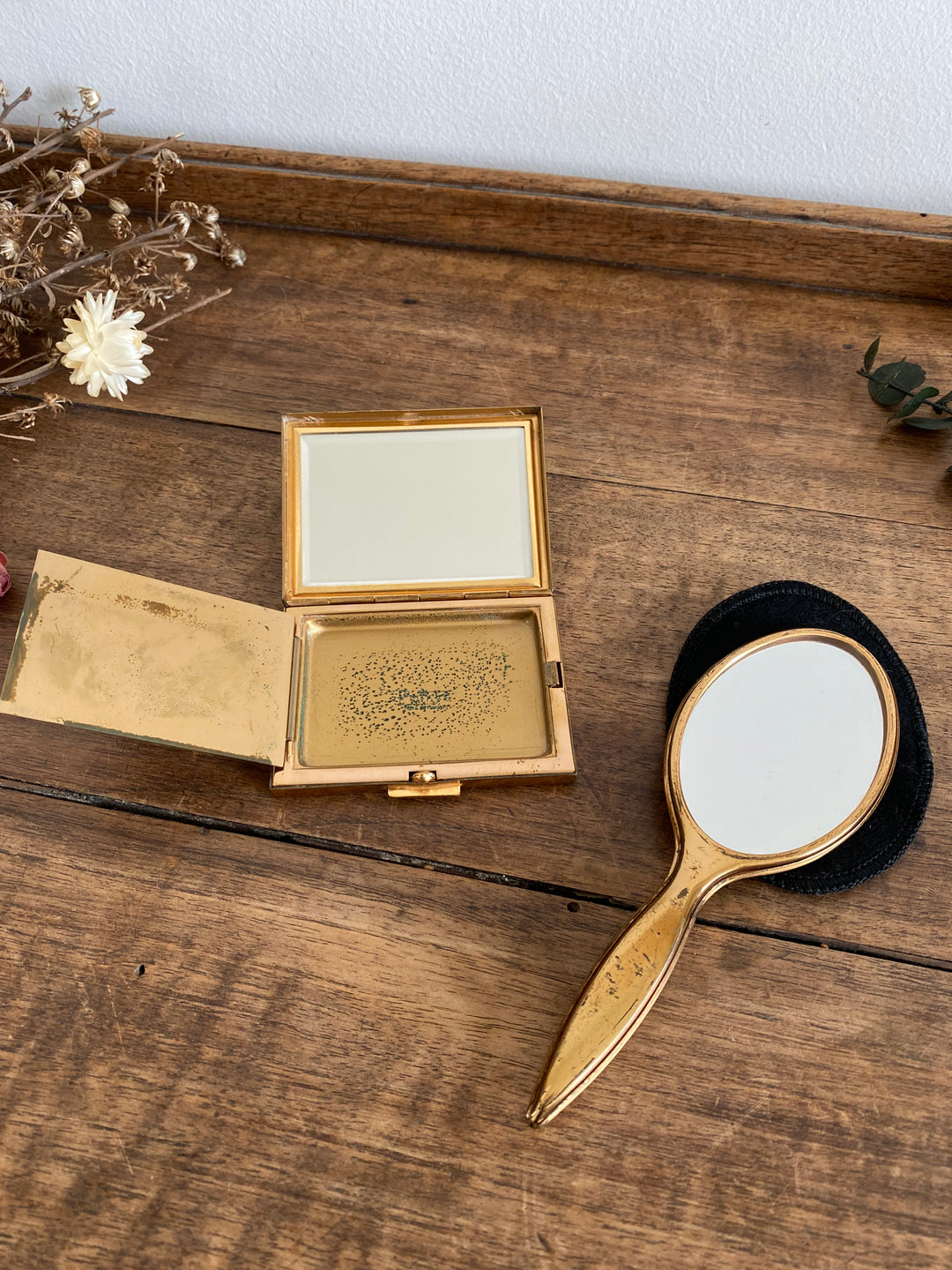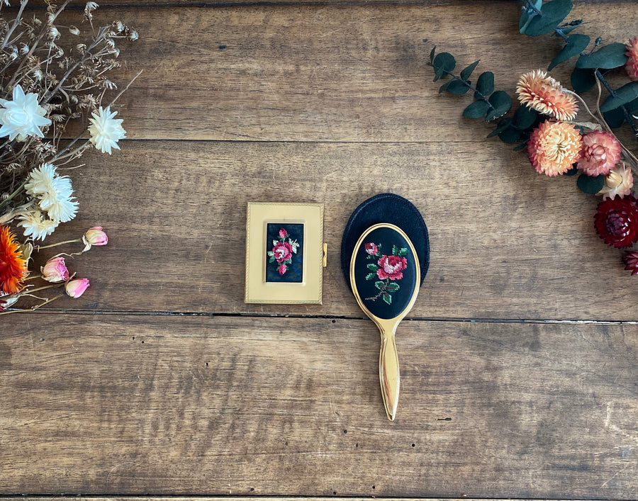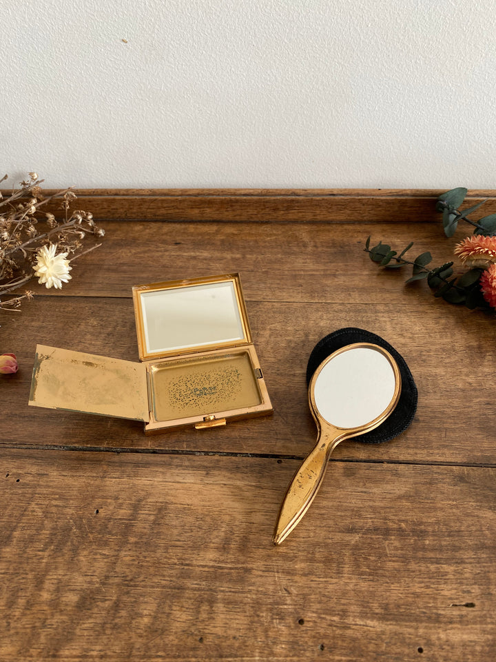 Ensemble composé d'un mini miroir à main et d'un joli petit poudrier en métal doré assorti. Chez Ma Cabane on aime les petites fleurs, surtout quand elles sont brodées ! Datant des années 50.
