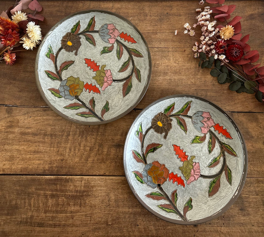 Charmant duo d'assiettes décoratives en laiton émaillé. Peuvent s'accrocher au mur ou faire office de vide poche. Vendues séparement.