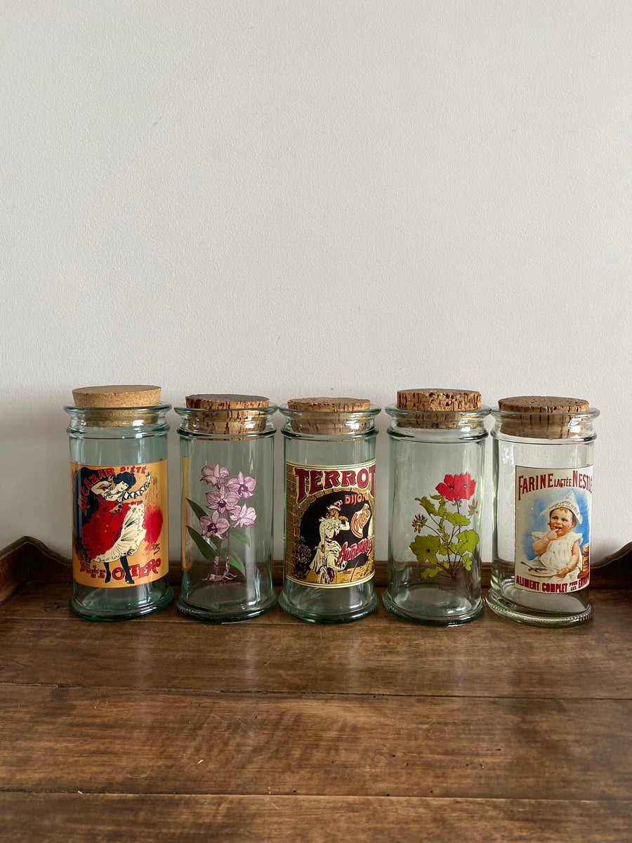 Joli lot de bocaux en verre épais de forme cylindrique avec bouchon liège. Estimation années 70. Vendus séparément.