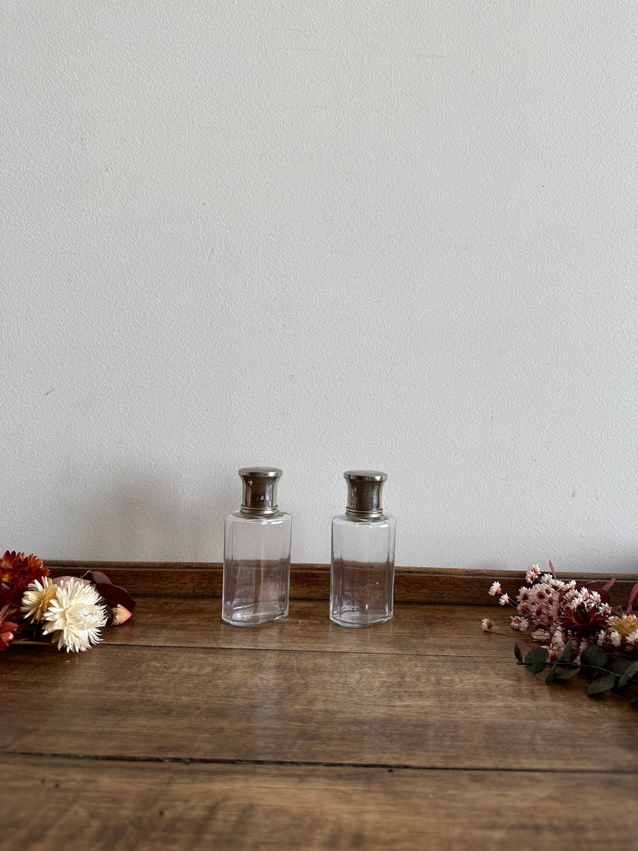 Charmant duo de petits flacons à parfum du début XXème. Dotés d'un bouchon en métal argenté. Ils disposent toujours de leurs bouchons internes d"origine. Vendus séparément.