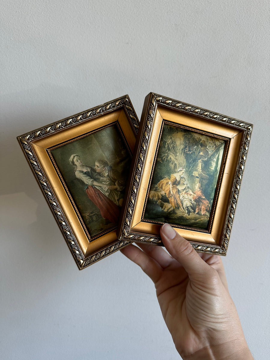 Ravissantes petites impressions sur soie encadrées. Jolies représentation d'oeuvres classiques d'époque. Estimation années 50. Vendues séparément.