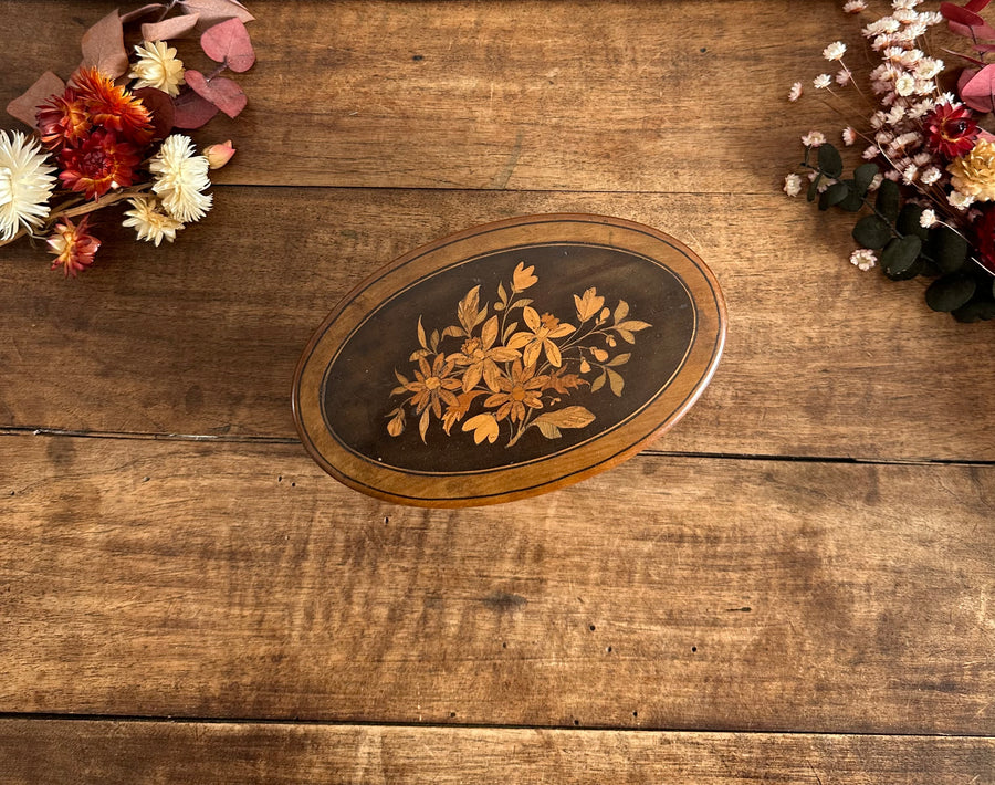 Boite en marqueterie ovale gravures roses
