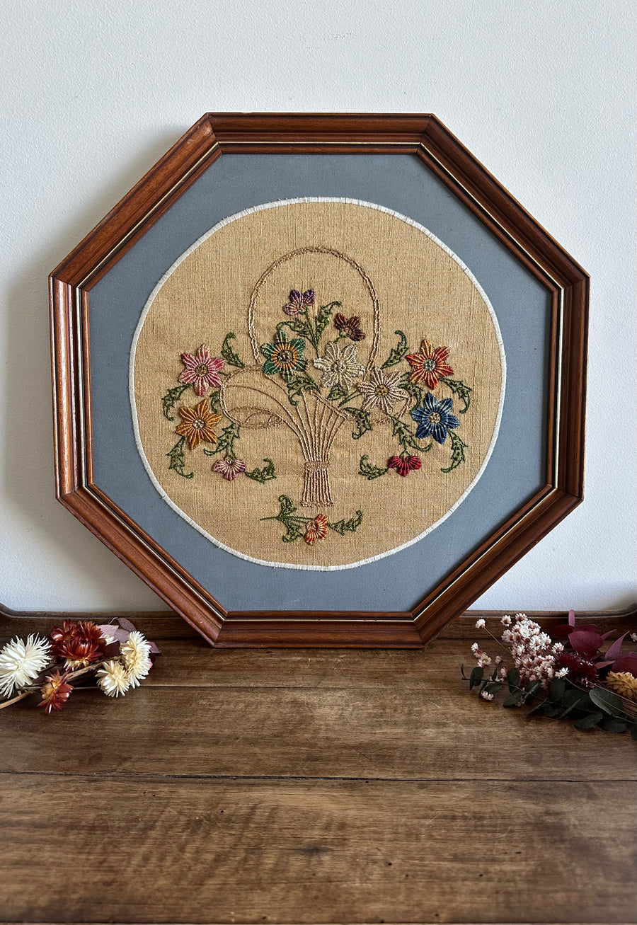 Superbe broderie datant des années 1890. Encadrement récent datant des années 50-60. On aime la délicatesse de l'ouvrage.