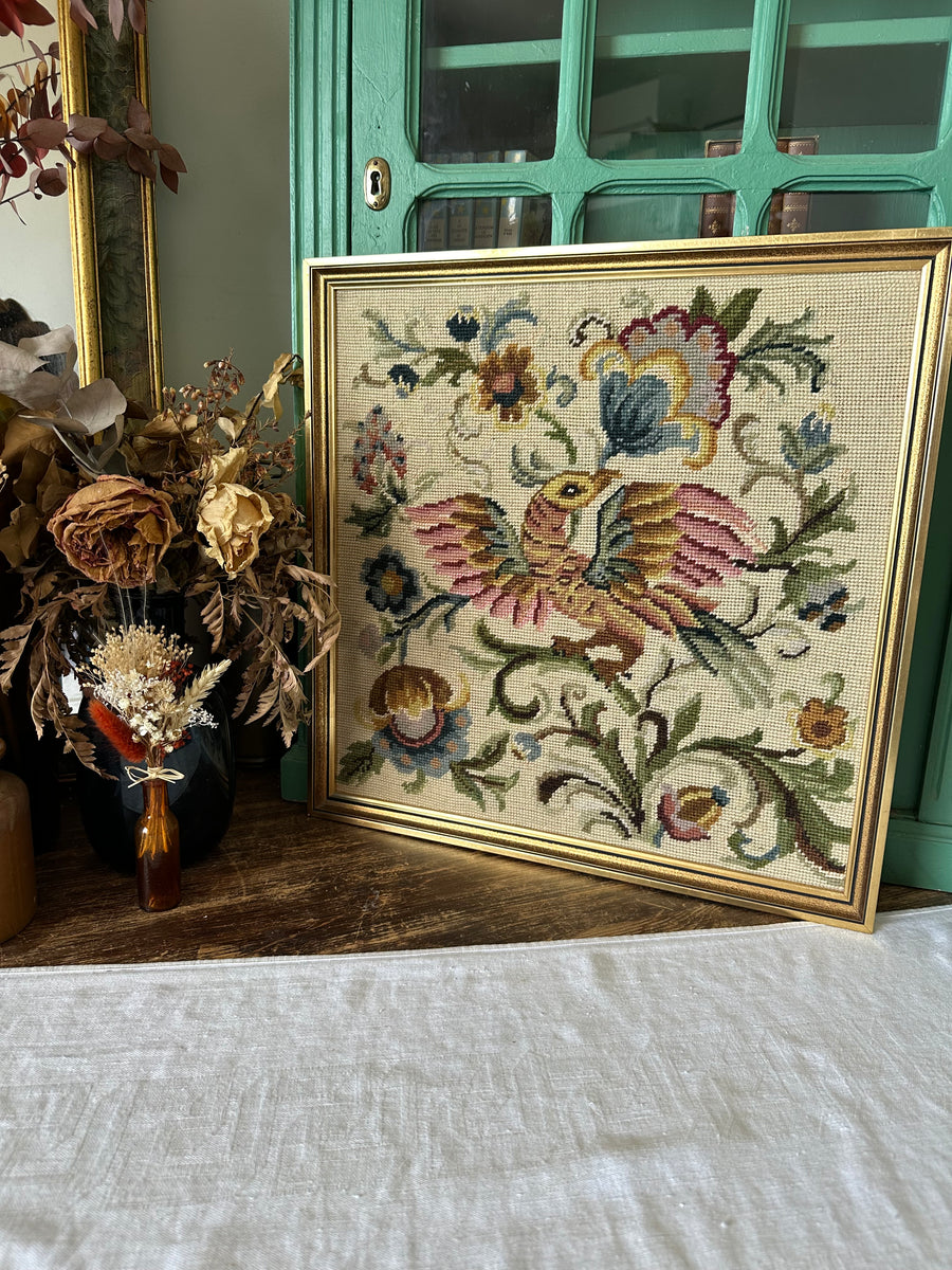 Belle broderie rectangulaire façon tapisserie anglaise. Broderie fait main. On aime les jolis motifs qui la décorent et ses camaïeux de roses. Estimation années 60.