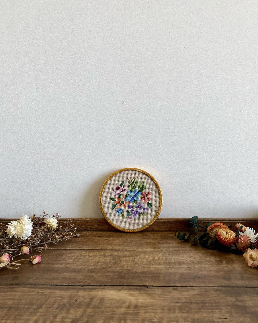 Adorable petite broderie sous verre cerclée d'une armature en métal doré travaillé.