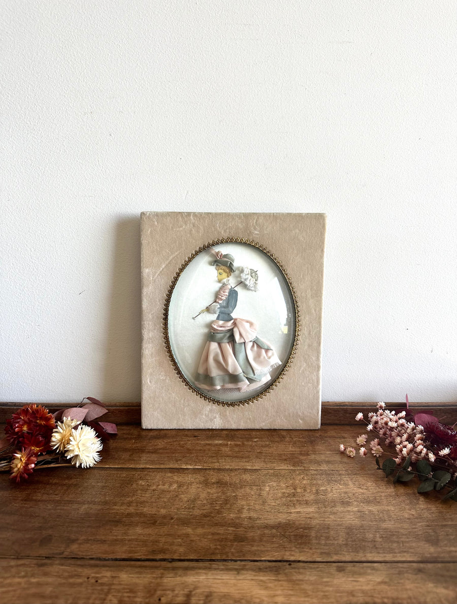 Charmante broderie représentant une jeune femme de belle toilette victorienne tenant une ombrelle. Visage peint à la main et robe en soie et dentelle. Verre bombé et cadre en velours couleur taupe. Estimation années 60