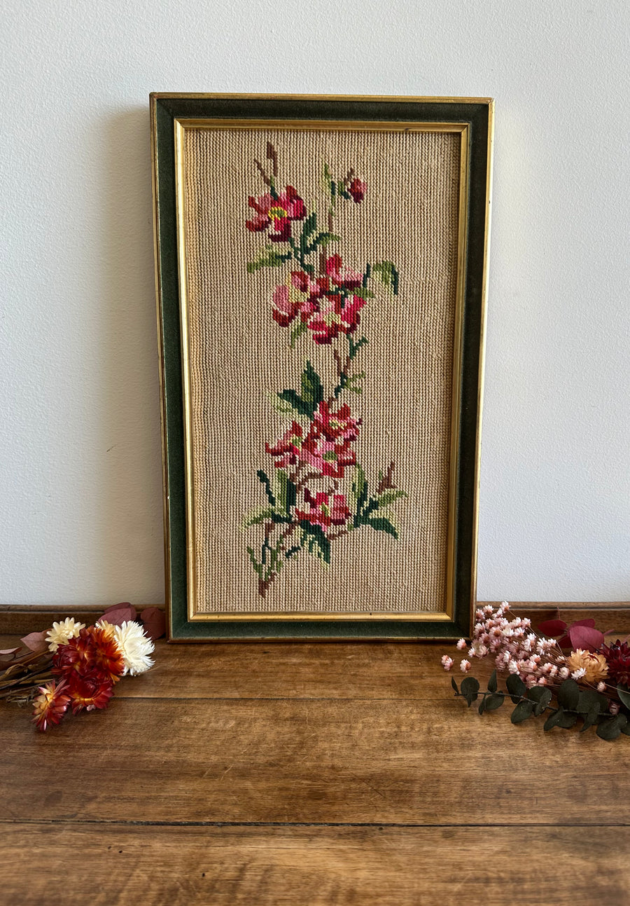 Belle broderie encadrée et bordée d'un joli ruban de velours vert. Estimation années 60.