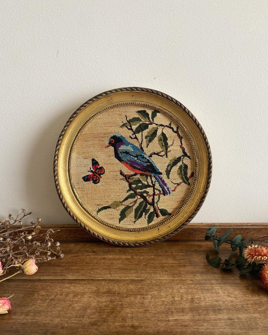 Jolie petite broderie ronde au cadre doré motifs oiseau et papillon