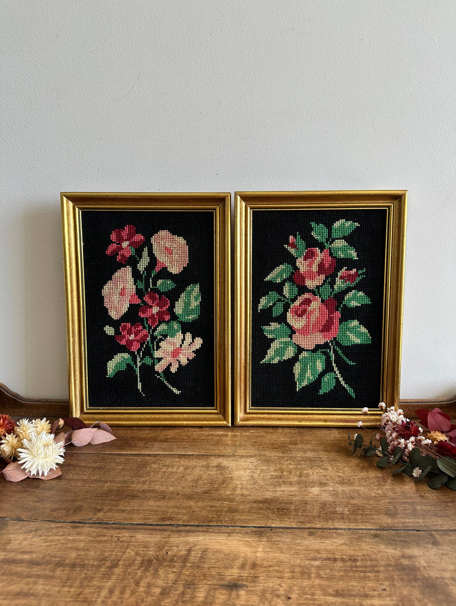Charmant duo de grandes broderies sur fond noir. Encadrement en bois doré. Estimation années 70. Vendues séparement.