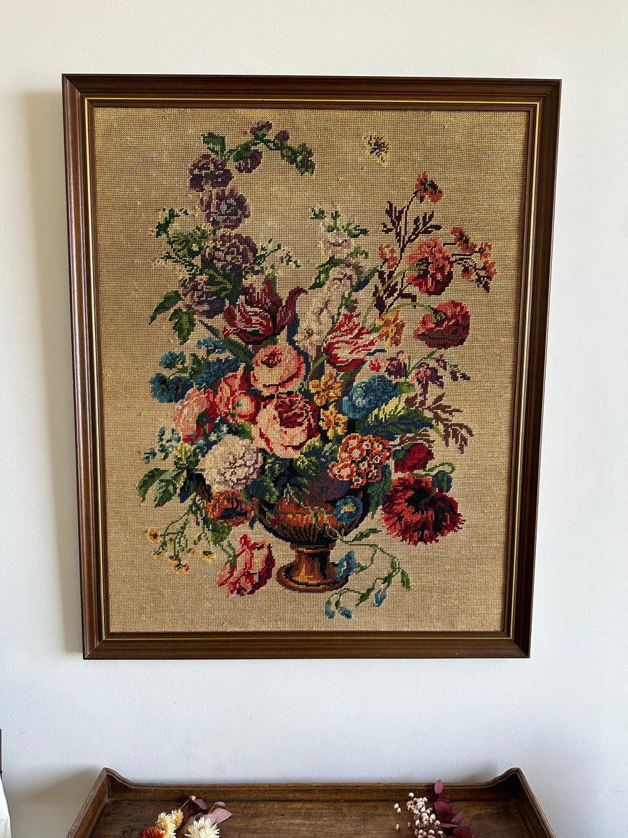 Superbe broderie au point de croix très grande taille. Grand bouquet de fleurs dans le style maximaliste baroque. Estimation années 50.