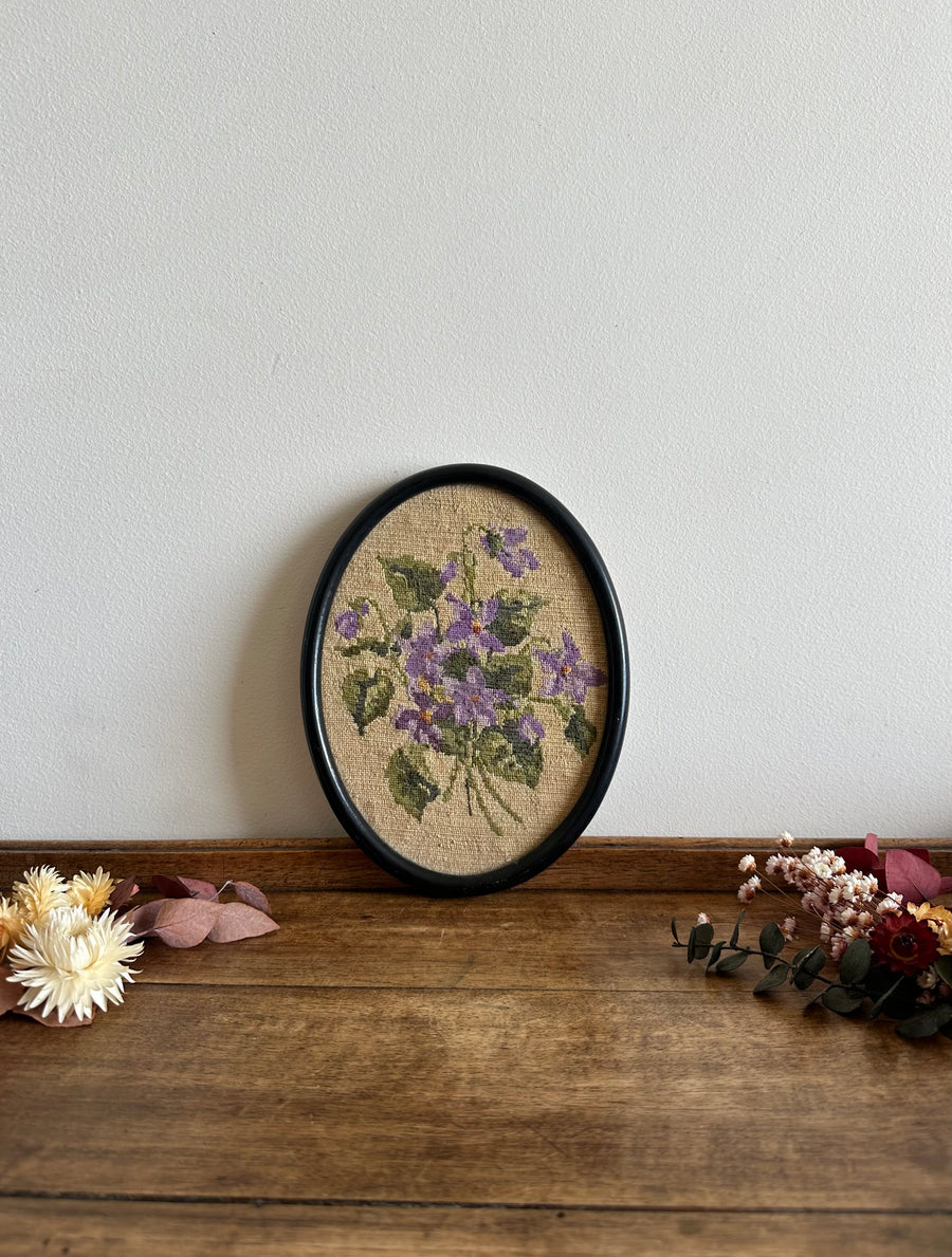 Jolie broderie encadrée. Broderie florale violettes. Encadrement en bois noir. De jolies traces du temps sur son cadre dûes à son grand âge.