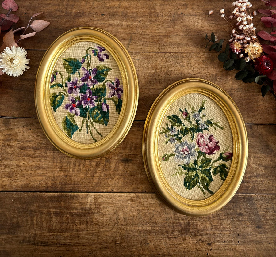 Joli duo de petites broderies florales des années 60. Cadre en bois doré. Vendues separement.