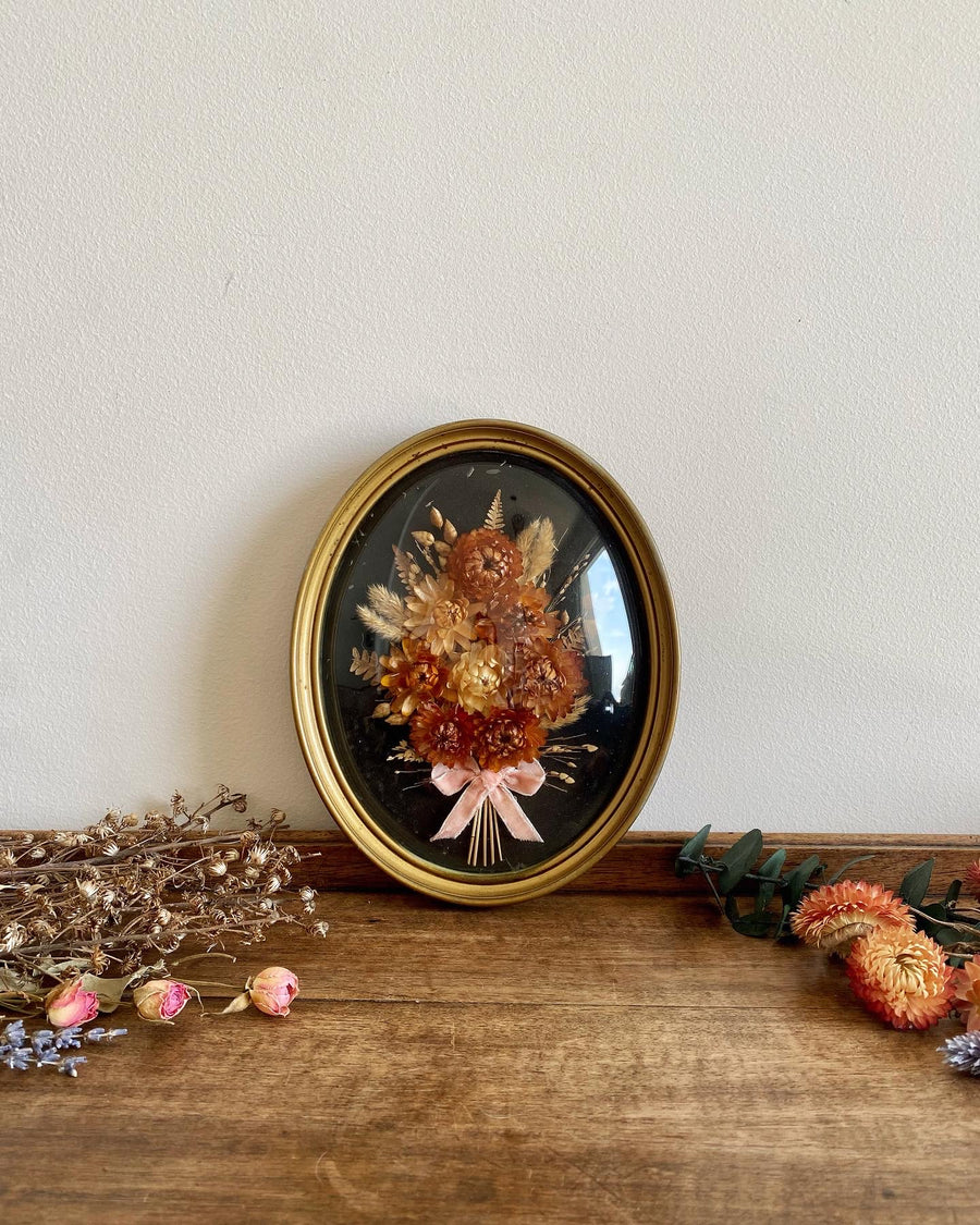 Joli cadre en verre bombé avec sa composition florale séchée vintage collée sur un écrin de tissu. N'hésitez pas à zoomer sur la photo pour admirer l’harmonie des couleurs !
