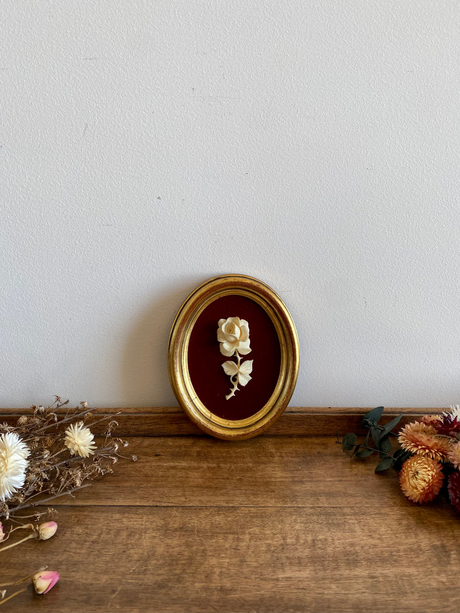 Ravissant petit cadre contenant une rose sculptée en résine couleur ivoire, sur fond rouge velours.