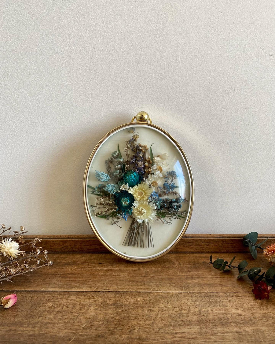Joli cadre doré en verre bombé avec sa composition florale séchée vintage aux jolis tons bleus.
