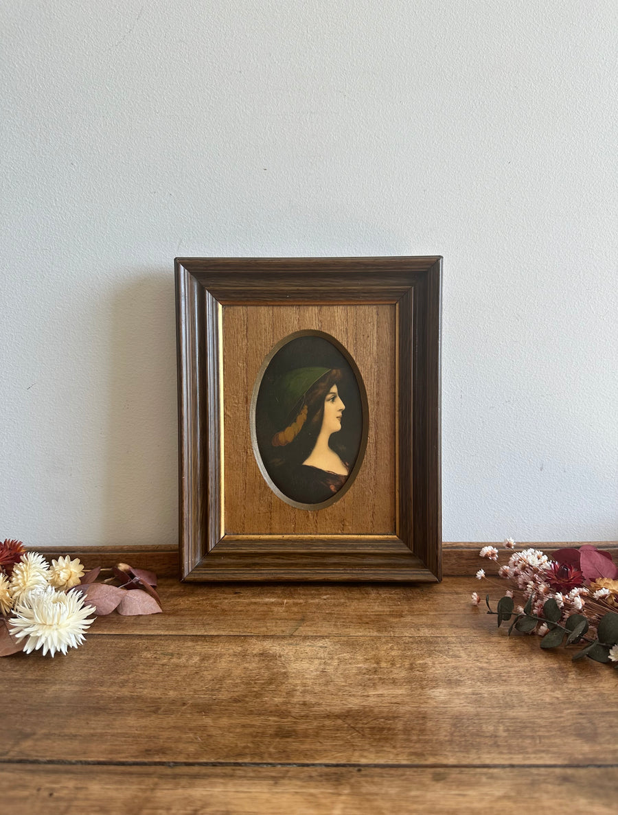 Ravissante impression encadrée. Portrait de jeune femme de profil. Cadre en bois marron. Estimation années 40.