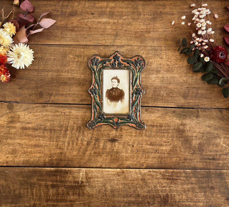 Charmant petit cadre photo à accrocher en métal peint. Objet résolument imparfait et plein de charme. Photographie d'une jeune femme des années 1880; Objet délicat.