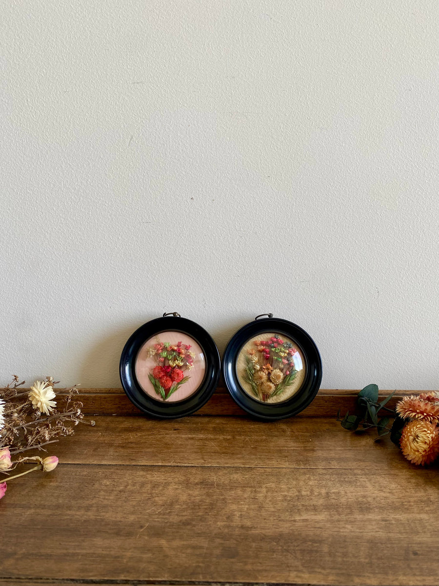 Adorable duo de petits médaillons de fleurs séchées sous verre bombé.