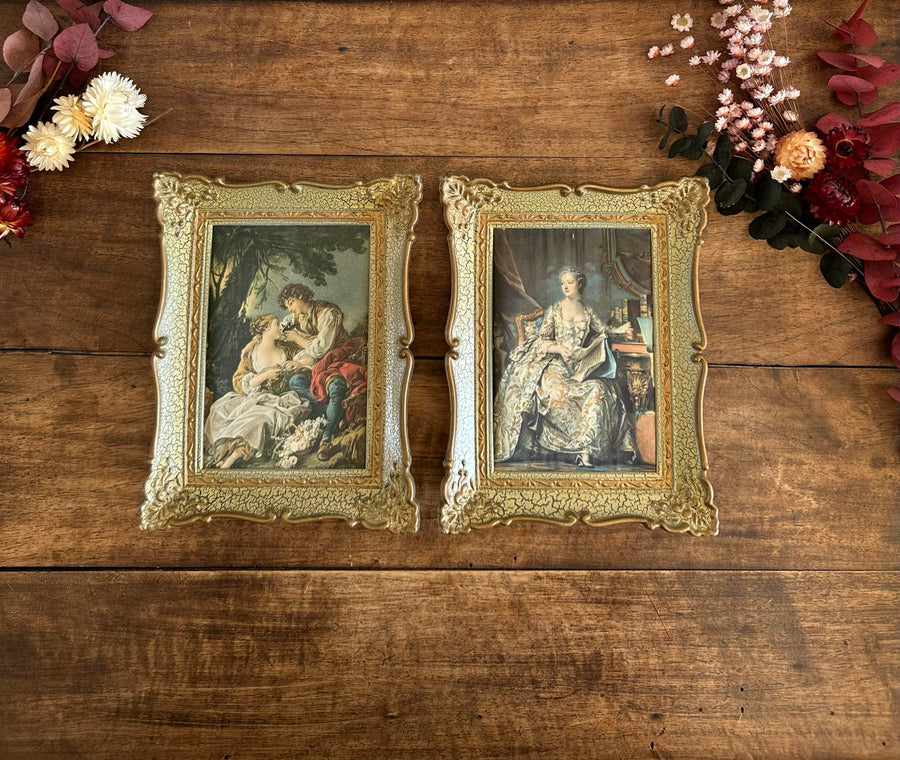 Cadres façon bois peint craquelé vert représentations classiques de De La Tour Mme de Pompadour