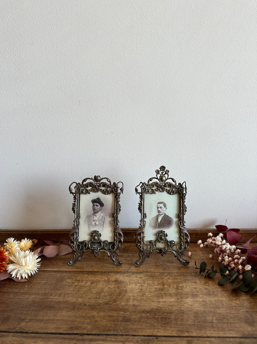 Coup de coeur pour ces deux petits cadres photos à poser époque Napoléon III. Structure en métal travaillé. Photo des années 1880 d'un couple de jeunes mariés. Il semblerait q'une petite partie de l'ornement superieur manque sur le cadre de la jeune femme mais cela n'ôte rien à son charme. Vendus ensemble.