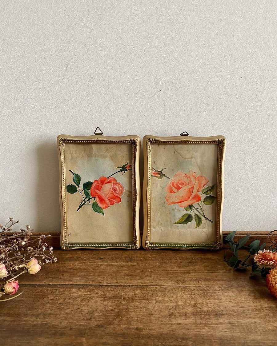 Lot de deux petits cadres rectangulaires couleur crème et or et leur représentation de rose. Ils ont vécu, certes, mais on les aime comme ça !