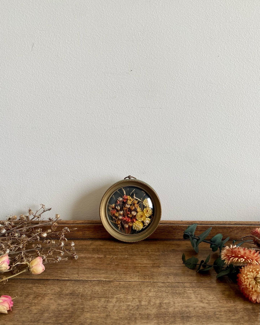 Adorable mini composition de fleurs séchées dans leur cadre bombé en plastique